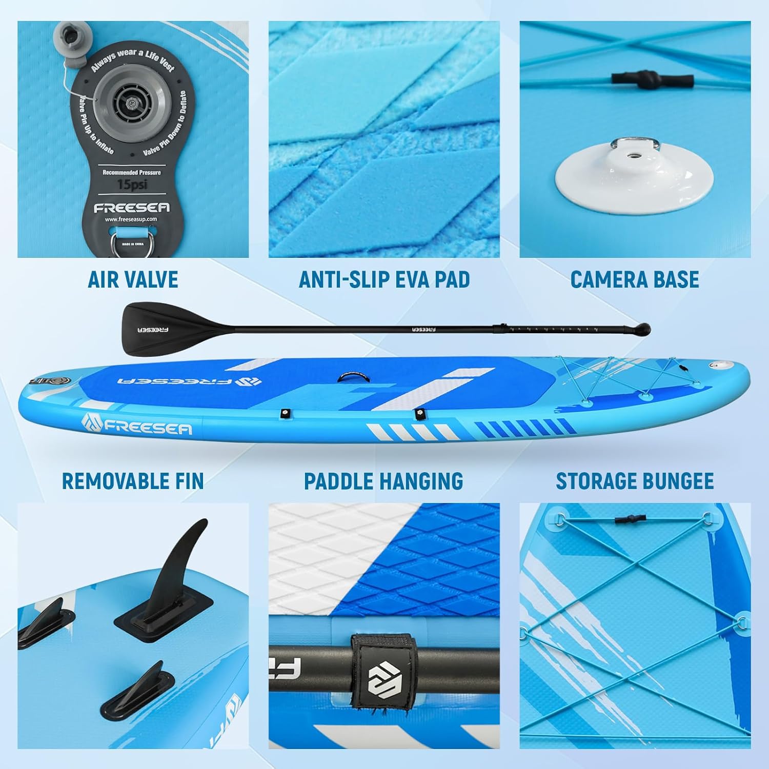 COMPLETE ACCESSORIES AND CONVENIENT EXPERIENCE – FREESEA paddle boards come with a great value accessory package that includes removable adjustable paddles, removable fins, oxford backpacks, two-way inflatable pumps, tie-down straps, foot ropes and repair kits. These accessories not only enhance the practicality and safety of the paddleboard, but also make it easier to carry and maintain, so that your journey on the water is hassle-free.