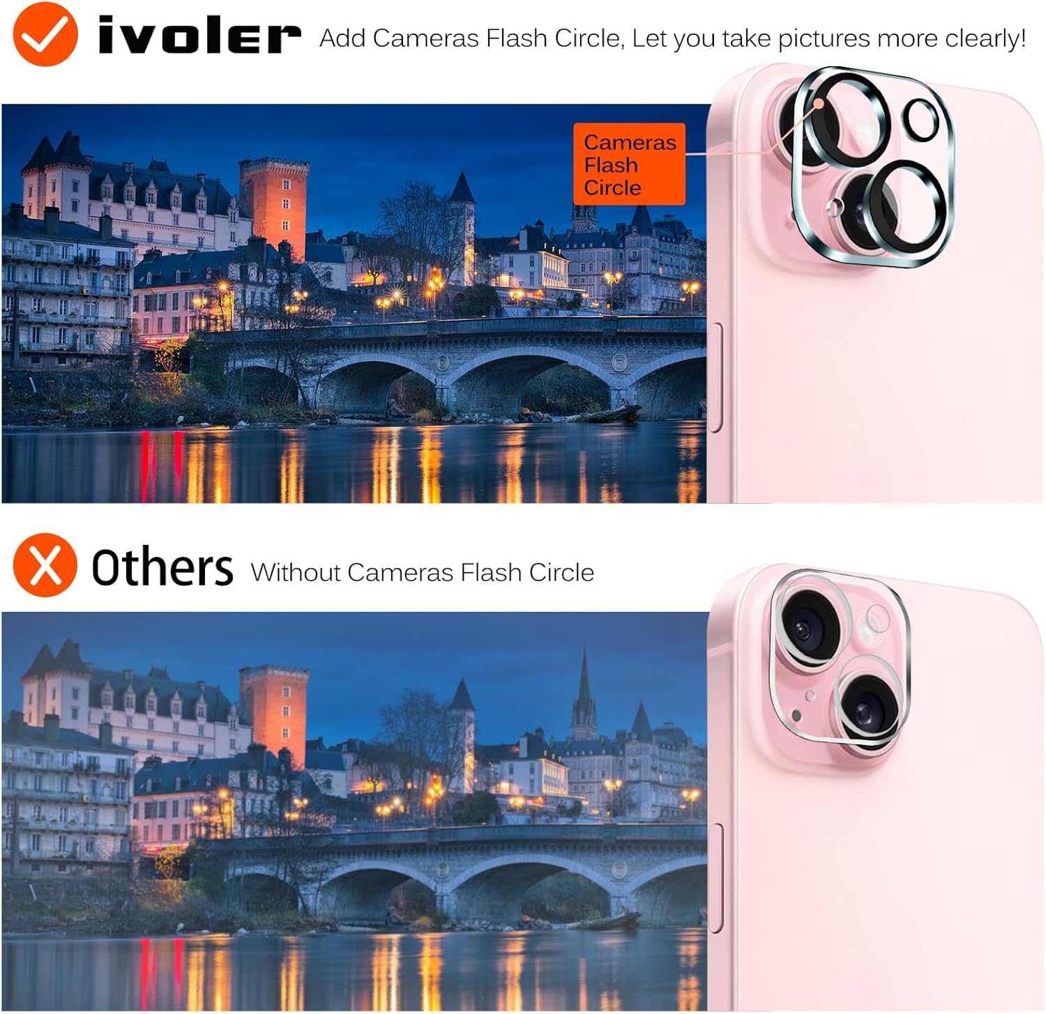 AR technology & Night shooting function: The glittering rear camera lens protector are featured with augmented reality “seamless” fusion new technology, with enhanced light transmission function, no need to design the flash hole position, even if the flash is turned on at night , it can be 99.99 % Guarantee the original quality of photos and videos.