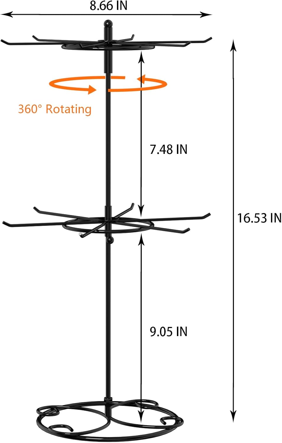 【Dimensional information】 Revitalize your merchandise presentation with our rotating jewelry display. This 2-tier, 12-hook marvel stands at 16.53 inches tall and spans 8.66 inches in diameter, ensuring every piece gets the spotlight it deserves.