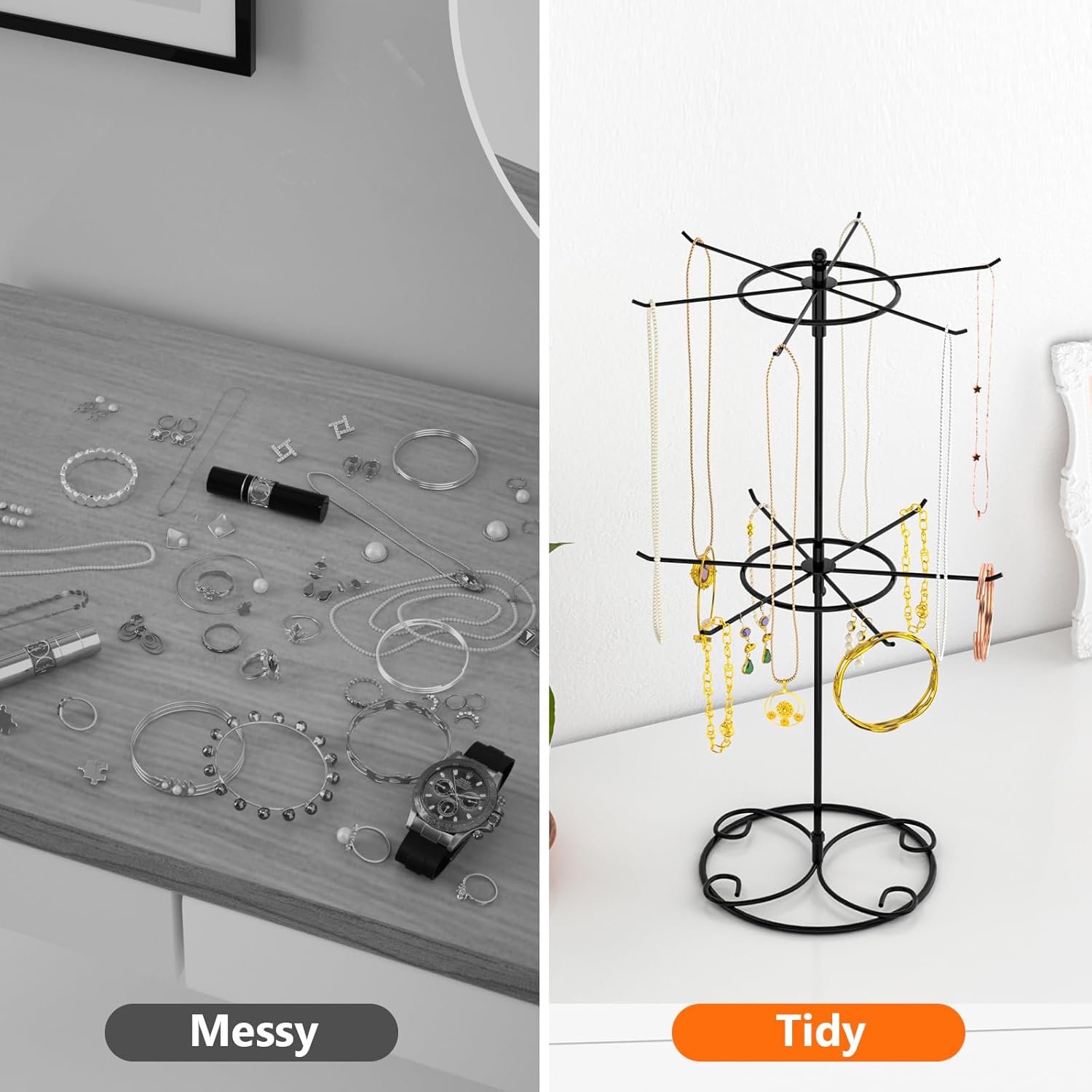 It features a rotating display function that offers a 360-degree view of various items.It has a diameter of 8.66 inches and a height of 16.53 inches, allowing it to hold necklaces and bracelets.The two-tier and 12-hook design of this organizer allows for convenient storage and display of multiple accessory.It offers multifunctionality, making it ideal for retail settings, craft shows, or enhancing the ambiance of your bedroom.
