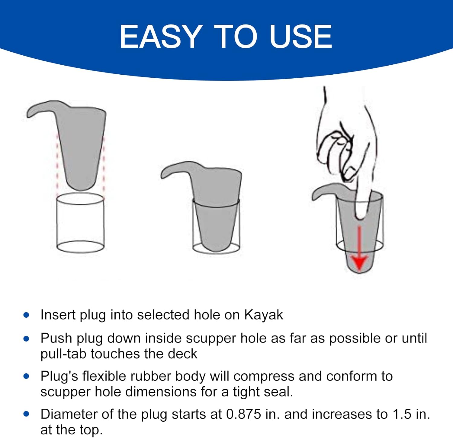 𝗗𝗲𝘀𝗶𝗴𝗻 𝗨𝗽𝗴𝗿𝗮𝗱𝗲𝘀 : Scupper plugs for kayaks, this kayak scupper plugs is an essential part for kayakers. These plugs are suitable for sitting kayaks with drain hole diameters from 1 “to 1-3 / 8”. (2.5cm to 3.5cm) Diameter of the plug starts at 0.875 in. and increases to 1.5 in. at the top. Please make sure your kayak size matches the product before buying.