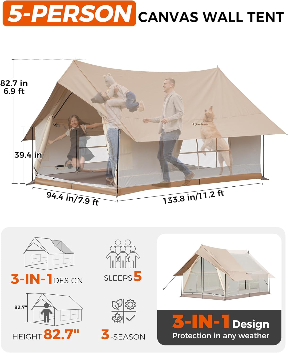 KingCamp 6/8 Person Camping Tent, Waterproof & Windproof, Easy Setup, Canvas Wall Tent with Large Windows, Ideal for Family Camping, Hiking & Outdoor Parties