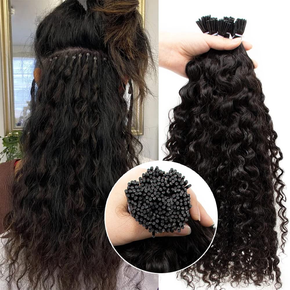 Kinky Curly I Tip Hair Extensions #1B Black Keratin Hair Extensions Stick I Tip Human Hair Bundles 16 Inch Pre Bonded Microlinks Real Hair Cold Fusion Curly I Tip Hair Extensions 100stands 50g