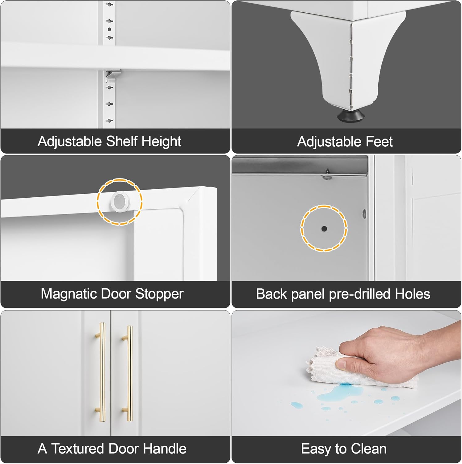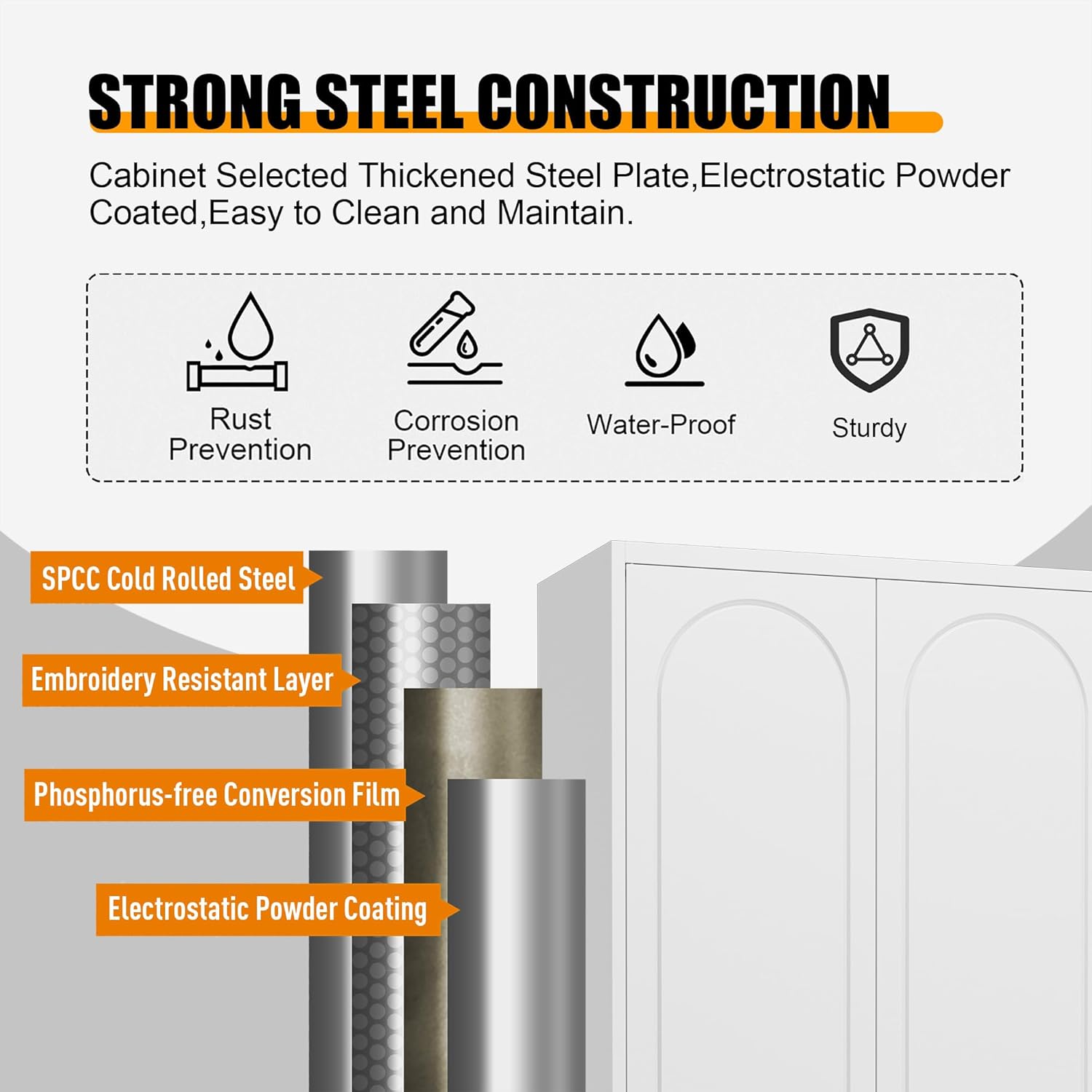 Metal Cabinet: The kitchen pantry cabinet is made of cold-rolled steel plate, with a powder coating process to prevent rusting. Sturdy, easy to clean surfaces. White large cupboards come with an anti-tip feature that prevents the kitchen cabinets from tilting and protects your family