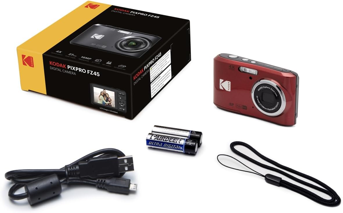 Introducing the FZ45 Friendly Zoom collection from the KODAK PIXPRO family of digital cameras. Compact, intuitive and oh so easy to use, the FZ45 is the perfect starter camera to take anywhere you go. One-touch video, red-eye removal, face detection and convenient AA batteries are just the start.27mm Wide Angle Lens – Everybody InWhy limit yourself to standing back to get the whole gang in the shot With a 27mm wide-angle lens, the FZ45 Friendly Zoom means you don’t have to. It gives you plenty of space to work with for all your friends.1080p Full HD Video – Fully DefinedFor those times when a photo isn’t enough, the FZ45 can record 1080p Full HD video so you can capture all of the action – however large or small.2.7-inch LCD – The Big PictureThe best way to make sure your photos are going to turn out great is to see them ahead of time. Thanks to a large, bright 2.7-inch LCD screen, you can do just that. Just point, frame, and shoot. Yes, it really is that easy!Getting Started – More Than Just The CameraWatch the unboxing video to see that in addition to the FZ45 Friendly Zoom Digital Camera, you also receive: 2 AA batteries, USB cable, wrist strap, quick start guide, warranty card, and service card.Share In The Community!Be a part of our long time family of dedicated photographers. The KODAK PIXPRO Camera Community is for the imaging enthusiast with a desire to learn, experience, a