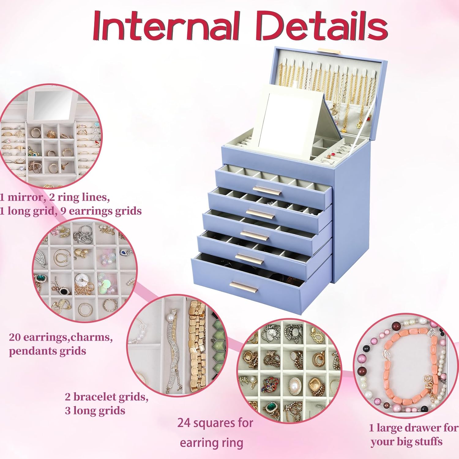 Elegant and Sturdy Construction: The first drawer has 24 earrings slots for earrings and Christmas charms organizing. The Second drawer was 6 bracelets grids for bangles,links and cuffs storage.The Third drawer with four long girds is perfect for your accessories such as sunglasses, lipsticks and watches storage. The bottom drawer is really a huge drawer for your big stuffs, even for you cosmetics