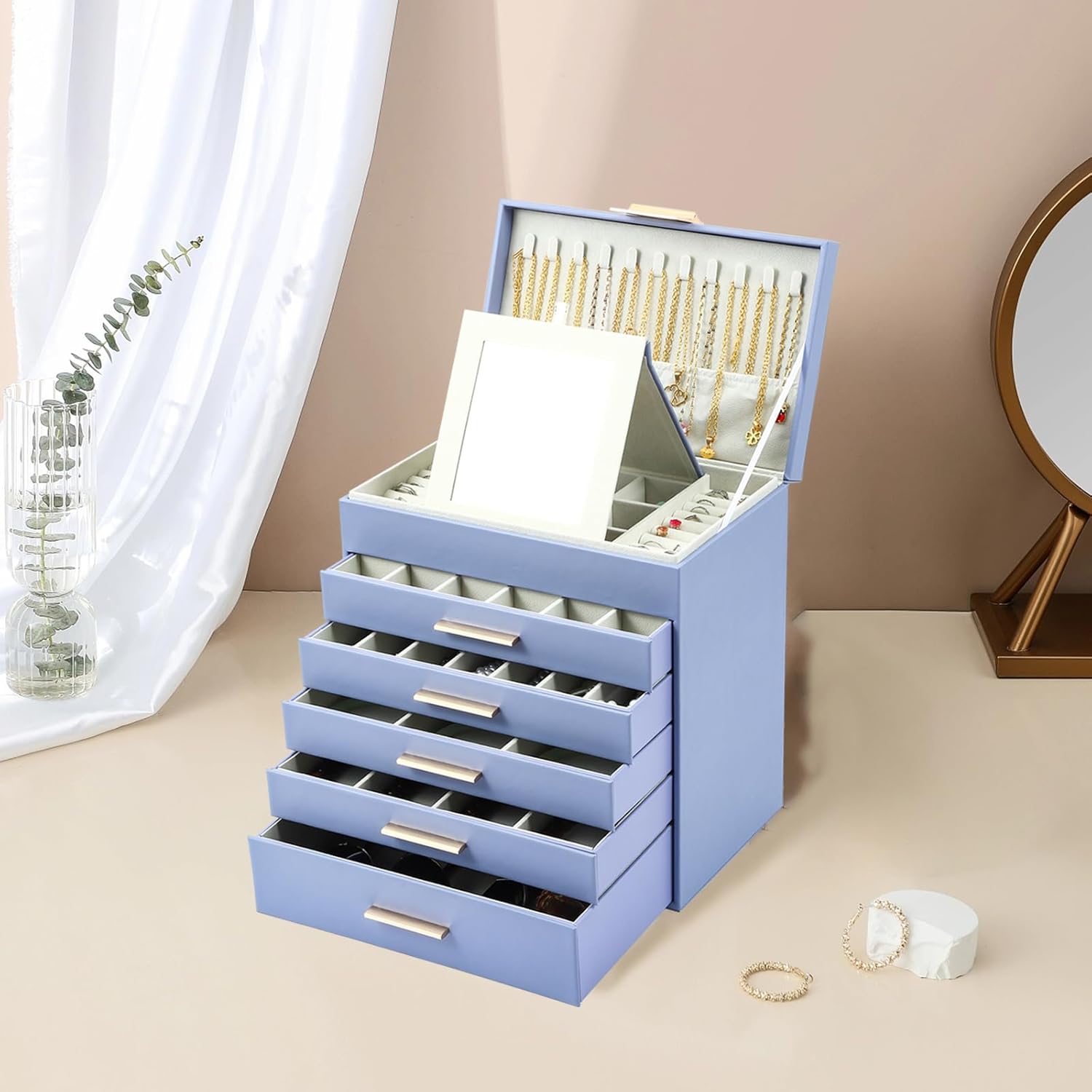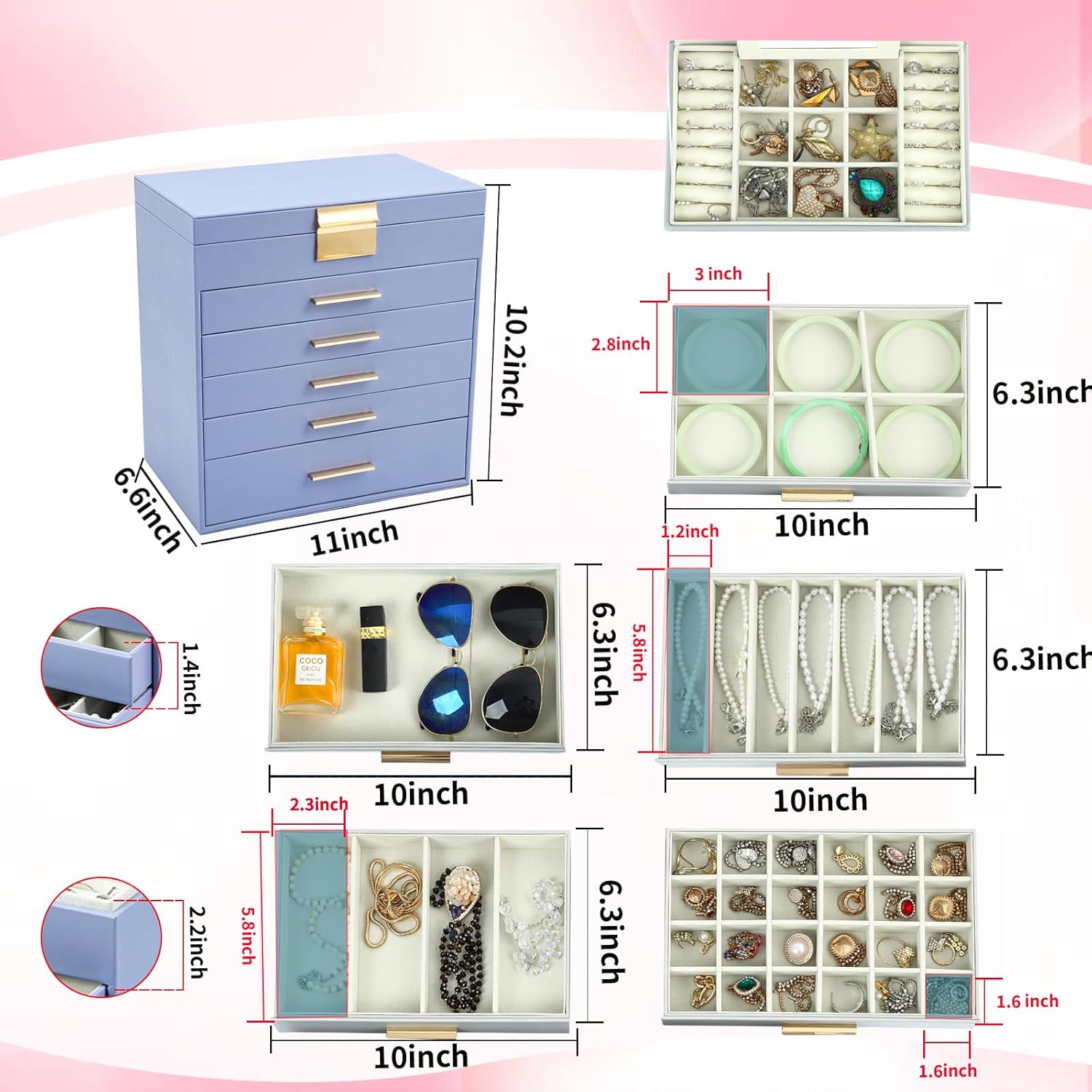 Organize Your Jewelry in Style: ASINGYER’s large jewelry box is the perfect organizer for all your precious accessories. With 6 layers and multiple compartments, it provides ample storage space for your earrings, rings, sunglasses, and necklaces. No more tangled messes or misplaced items