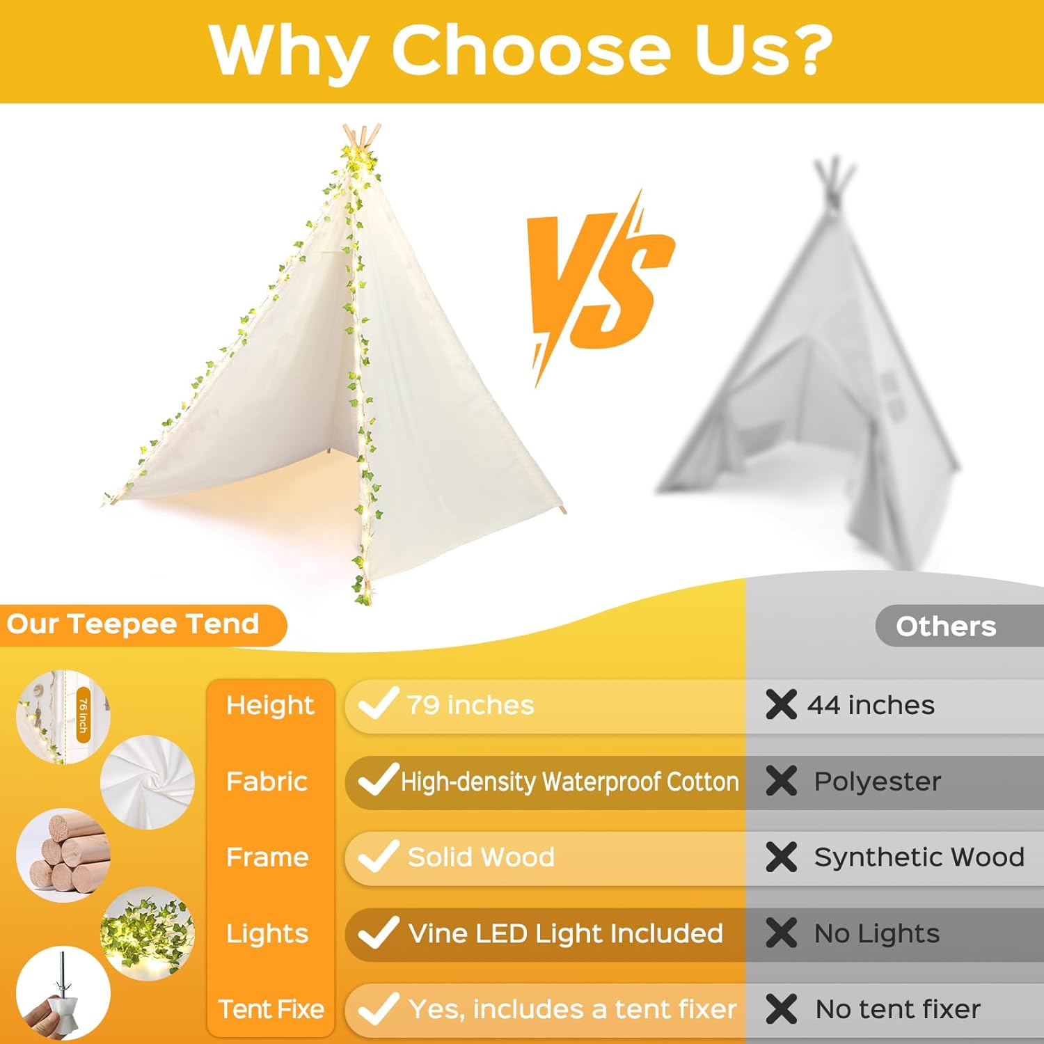 Be the first to review “Large Teepee Tent 79-Inch, Waterproof Cotton Super Spacious Indoor/Outdoor Play Tent for Kids with Solid Wood Poles, Kids Birthday Gift, Party Tent Featuring Vine Lights”