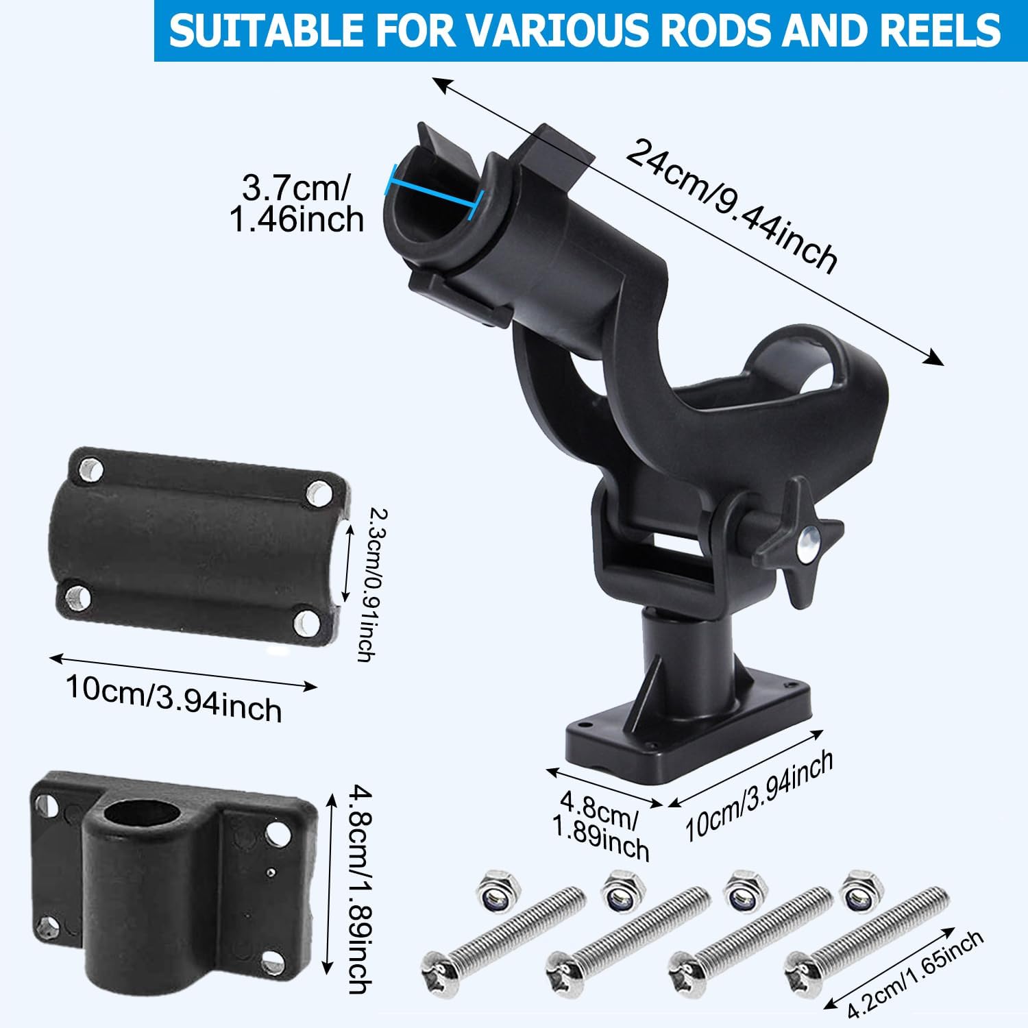 【Adjustable Multi-Functional Rod Holder】Large locking knob offers 150° tilt angle adjustment, and also adjustable 360° horizontally, and compatible with rods up to 1.46 inches which Suitable for most rods on the market
