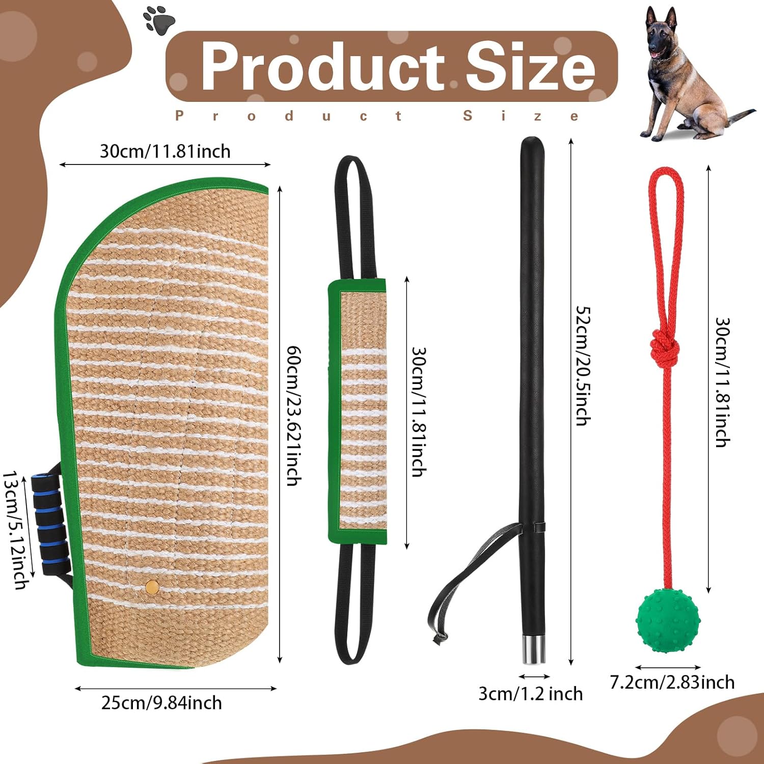 Proper Size: the dog chew sleeve is approx. 23.6 x 11.8 inches/ 60 x 30 cm, the dog chew tug toy is approx. 11.8 x 3.15 inches/ 30 x 8 cm, the dog training stick is approx. 20.5 x 1.2 inches/ 52 x 3 cm, and the dog chew rubber ball is approx. 2.8 inches/ 7.2 cm in diameter, chew sleeve is large enough for dogs to chew, and you don’t need to worry about an accidental dog chew, you can train dogs with this dog training equipment for tug of war, rope skipping, agility and more