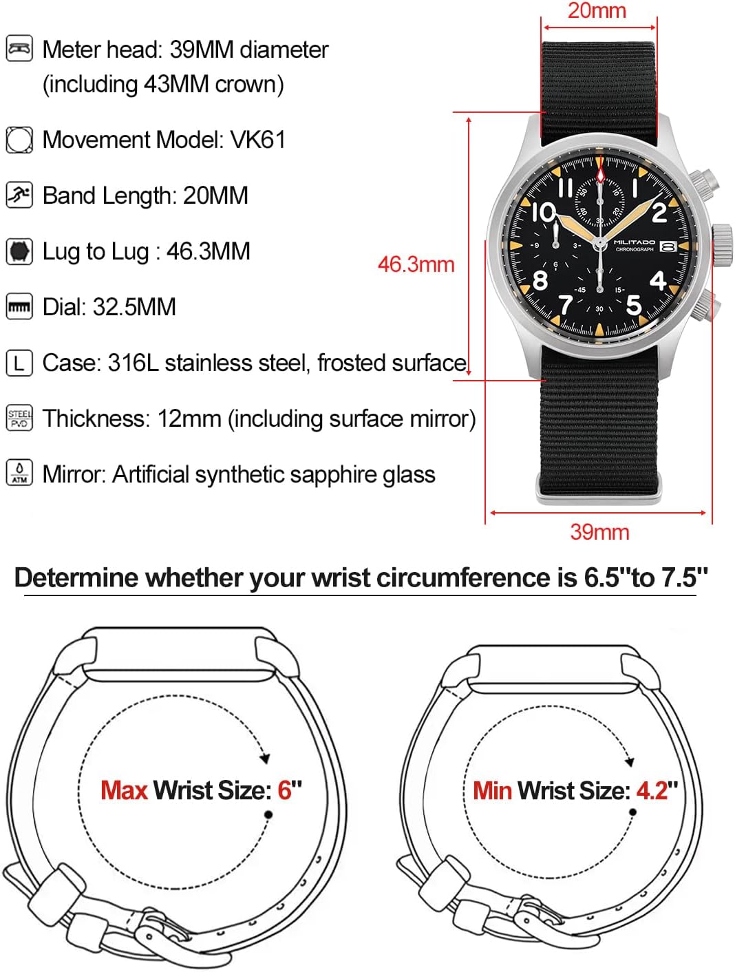 Militado Military Chronograph Watches 39mm Sapphire Crystal VK61/VK67 Quartz Luminous Wristwatches for Men 100M Waterproof Watch with Nylon Strap