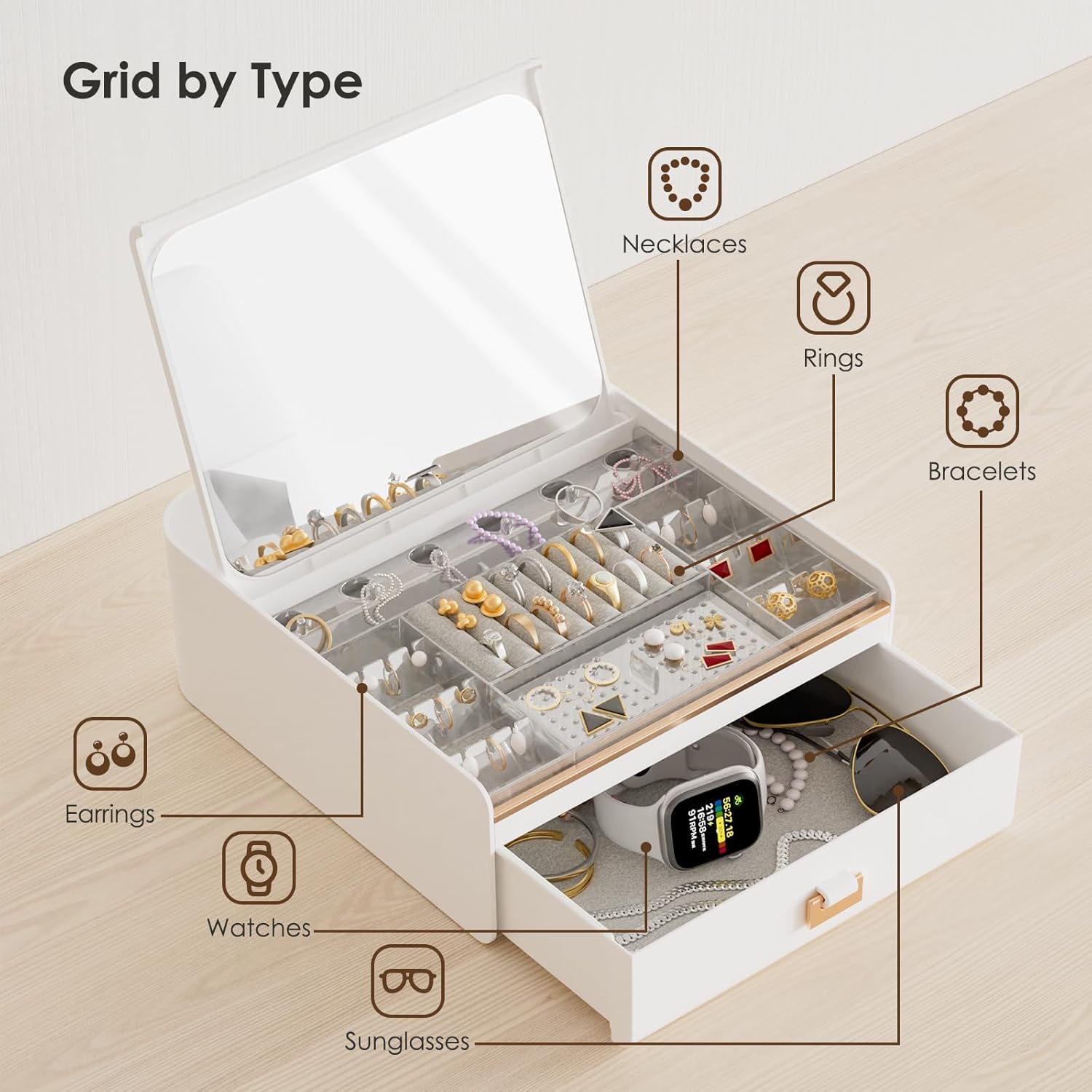 NATURE’S SOURCE Jewelry Organizer with Drawer and Mirror, Jewelry Box for Women Girls, Grid Storage Case for Earrings Necklaces Rings Bracelet Holder- White