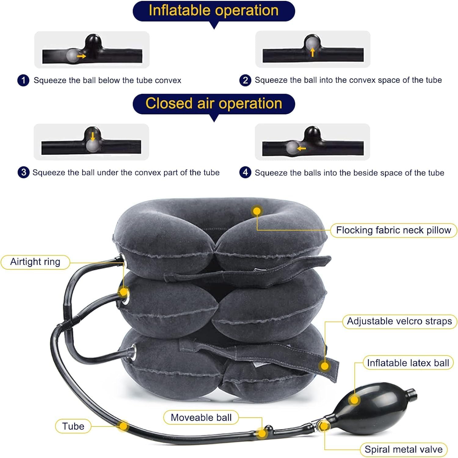 【Triple Leak Protection】 – There are three ways to avoid gas leaks: a ball in the tube, bleed valve, and split three-pipe design. And the neck traction device can be inflated at the same time, and the air intake is synchronized. Even with regular use of this neck stretcher cervical traction, no air leaks.