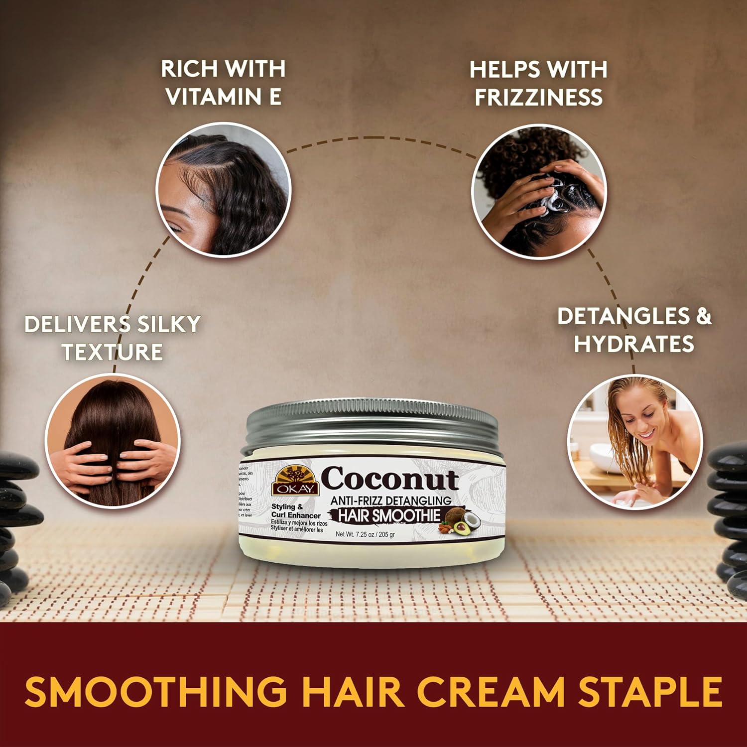 Okay Coconut Anti-Frizz Detangling Hair Smoothie is a styling and curl enhancer that penetrates the hair shaft to infuse moisture for smooth, frizz free, well-defined curls. Our unique blend of Coconut oil replenishes nutrients that provide shine and luster leaving hair manageable and beautiful.