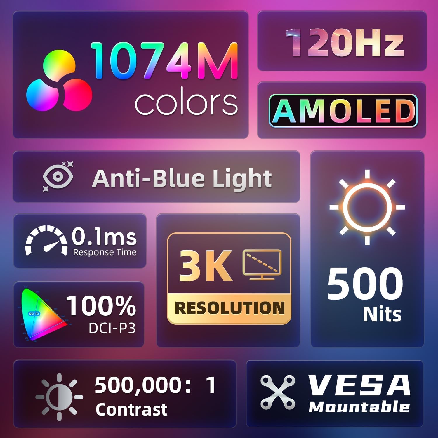 【High-performance specifications】The OLED portable monitor offers 500 nits brightness, 2880×1800 resolution, 0.1ms response time and a 120Hz refresh rate for smooth visuals. Its 100% DCI-P3 color gamut and AMOLED display ensure vibrant colors and deep blacks, while anti-blue light technology reduces eye strain.