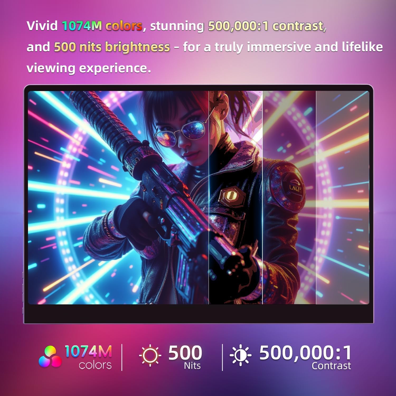 QniuueCent 16″ OLED Portable Monitor features an AMOLED display with a 500,000:1 contrast ratio, offering deeper blacks and vibrant colors. With 500 cd/m² brightness, it ensures clear visuals in any environment, while the 100% DCI-P3 color gamut delivers accurate and vivid colors. Perfect for professional editing and immersive entertainment, the AMOLED technology provides unmatched visual performance.