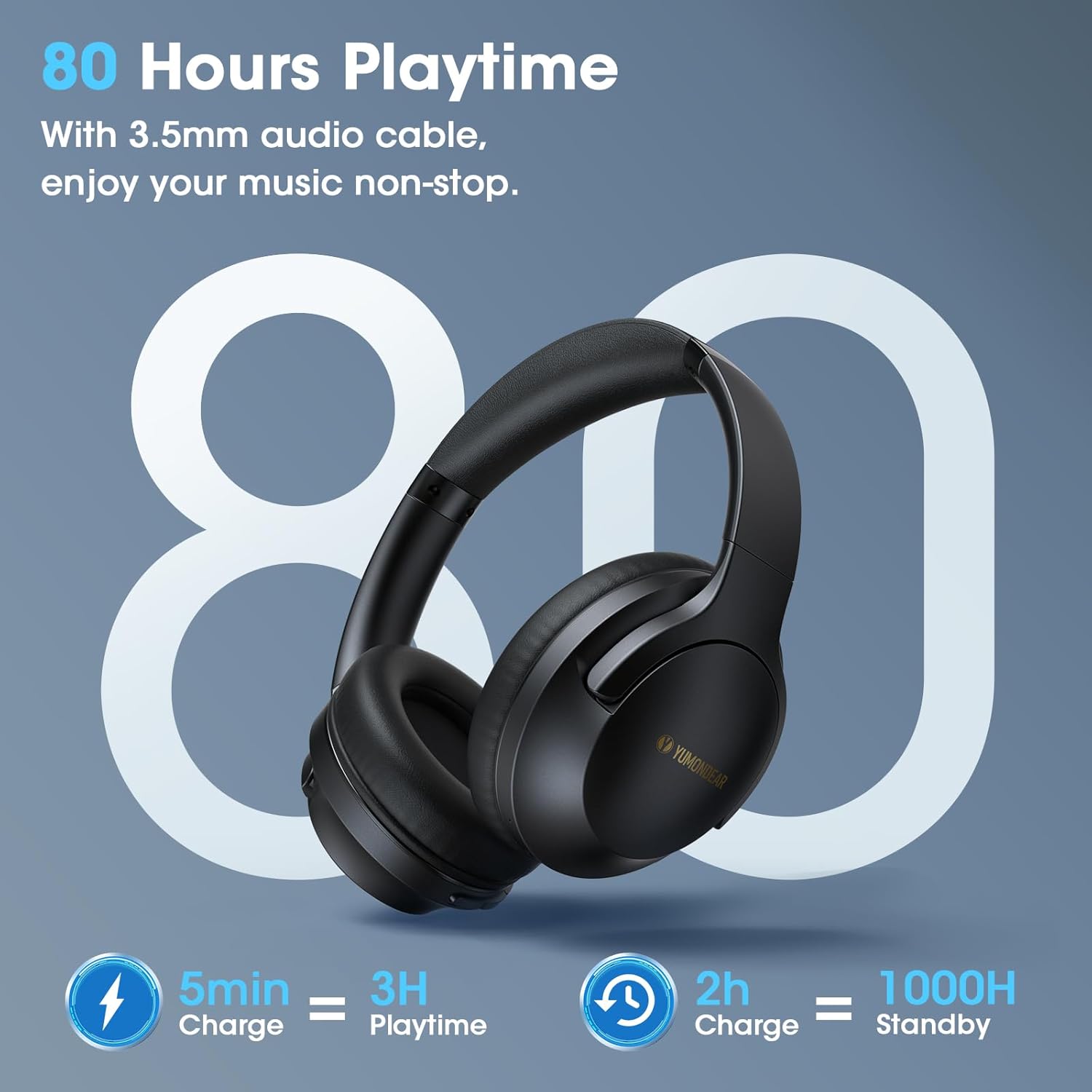 80-Hour Playtime & Wired/Wireless Freedom: Outlast your longest day: These wireless over the ear headphones run 80+ hours on a single charge—enough for 1,000+ songs or 3+ days of nonstop use. Low battery? Switch to the included 3.5mm AUX cable for headphones wired and wireless flexibility. Ideal for flights, commutes, gym, or workout, the bluetooth over ear headphones keep you powered through every adventure.