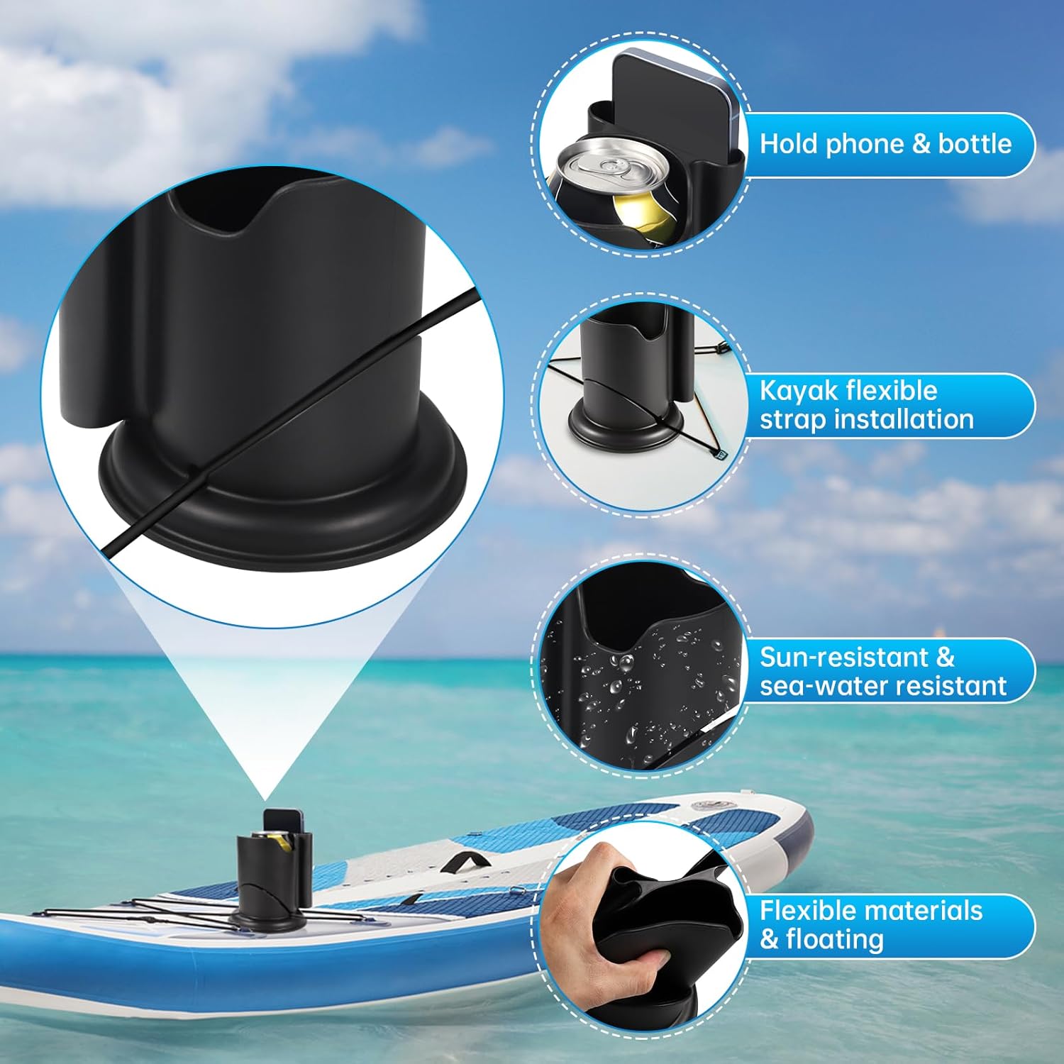 Paddle Board Cup Holder, Kayak Cup Holder 2-in-1 Drink & Phone Holder, Paddleboard and Kayak Accessories for SUP, Kayaking, Fishing, Yoga, or Surfing Adventures(Black)