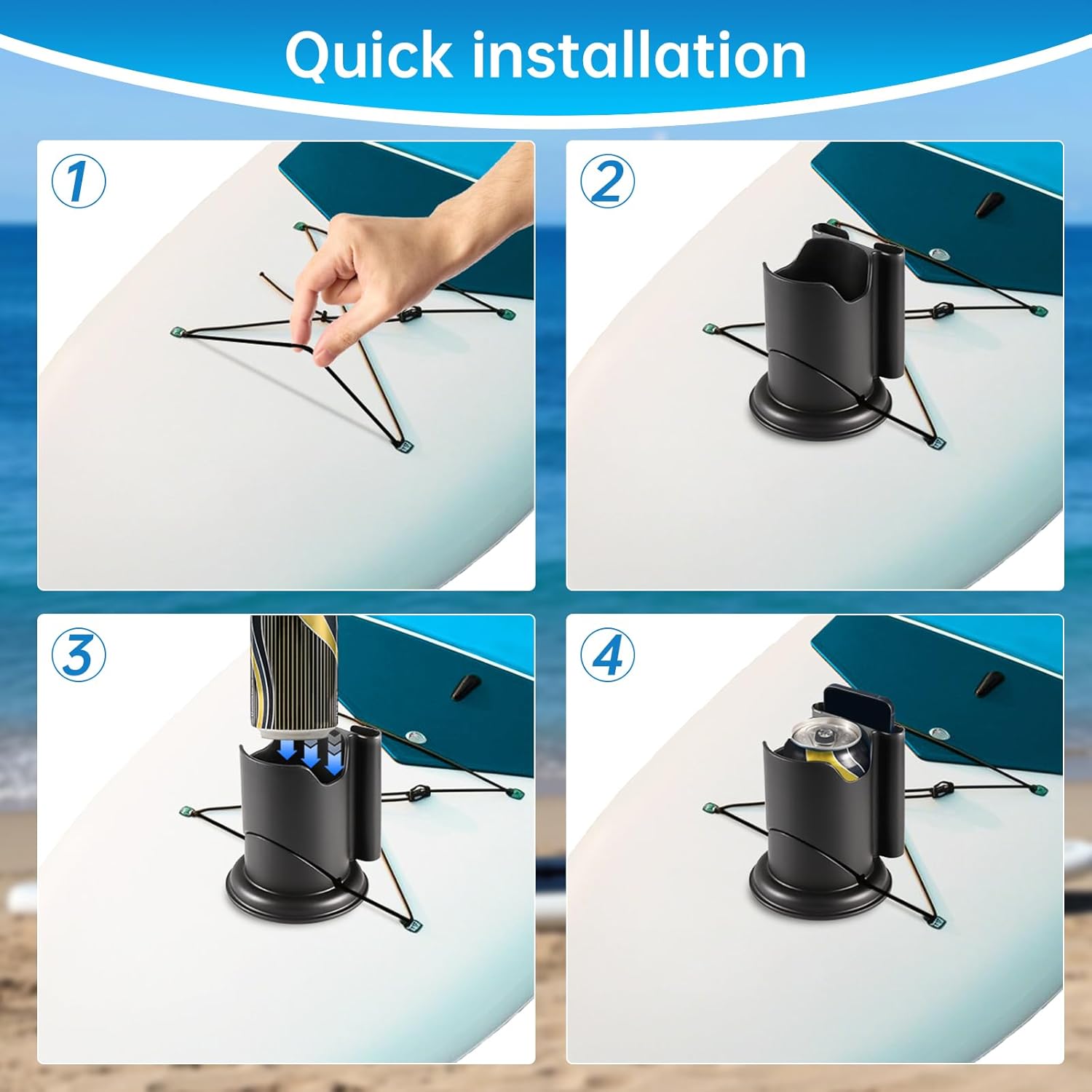 Easy Installation: Simply slide the paddleboard drink cup holder under your paddleboard’s bungee ropes. This cup holder is easily removable for effortless cleaning and maintenance. The slanted cut design ensures a secure fit under existing bungee cords—no tools or glue required—while maintaining stability to prevent accidental detachment.