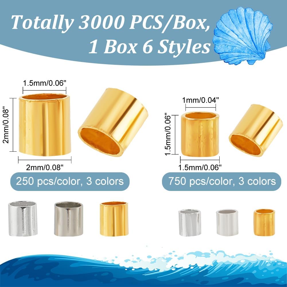 PH PandaHall Tube Crimp Beads, 3000 Pcs 1.5mm 2mm Brass Tube Crimp End Spacer Beads Cord End Caps Loose Stopper Beads for Earring Bracelet Necklace Pendant DIY Jewelry Making, Golden/Silver/Platinum