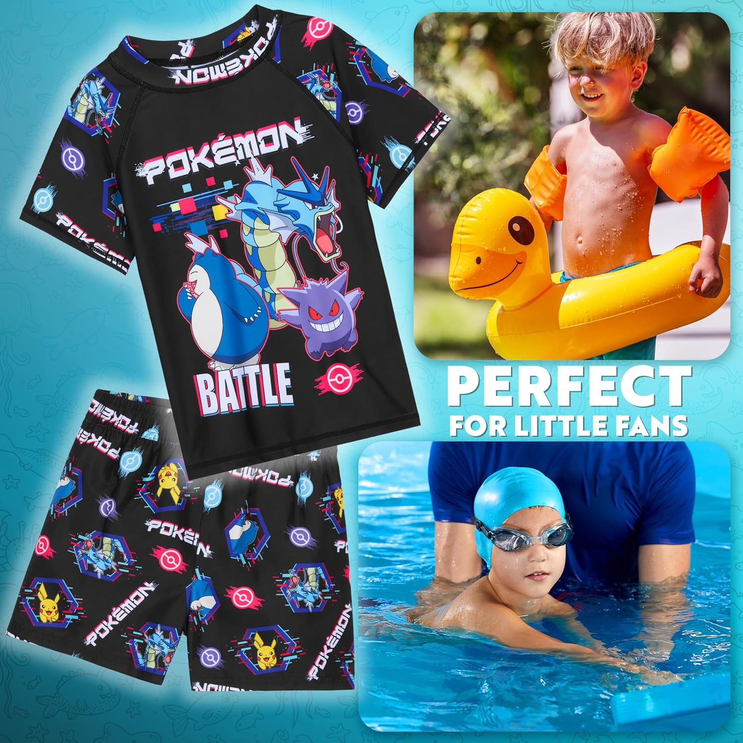 Pokemon Boys Bathing Suit 2 Piece Set Swim Suit with Boys Swim Trunks and Rash Guard