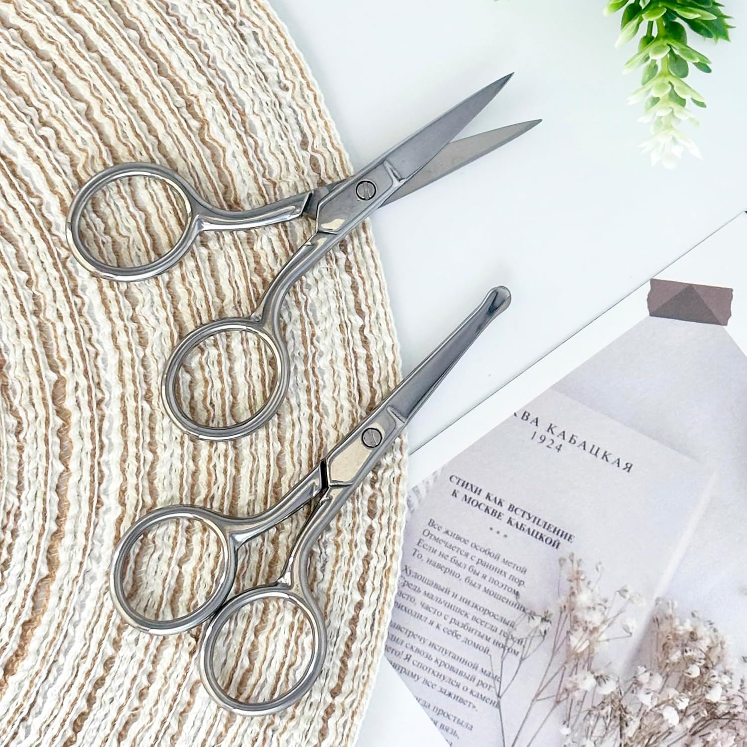 Professional Eyebrow Scissors, 3.5in Small Precision Scissors, 2 Pairs Hair Cutting Shears Round & Sharp Tip Scissors, Multi-Use Grooming Scissors for Facial Hair, Eyebrows, Beard, Nose, Moustache