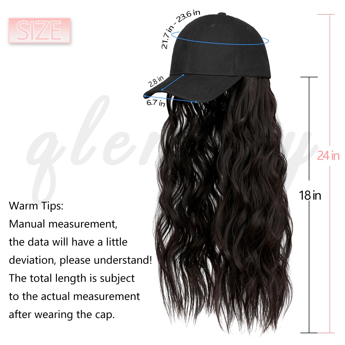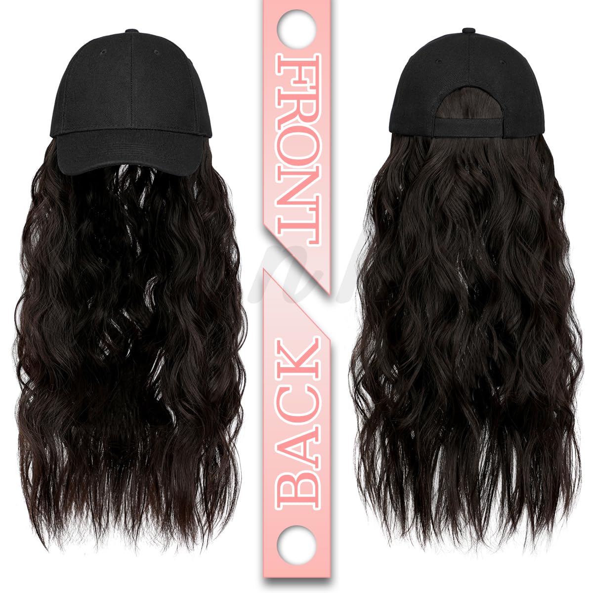Specification & Material: Baseball cap with 2b wavy hair is made from high-quality synthetic fibers, which is as soft as feels and acts like natural hair. Overall length: 24 in; Hair length: 20 in; Weigh: about 0.5 lb