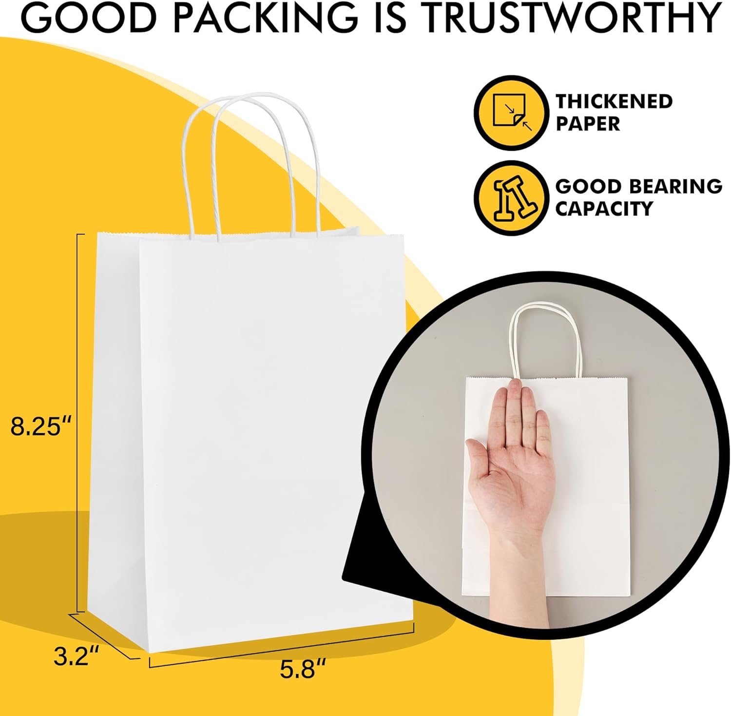 RACETOP White Paper Bags with Handles Bulk 8″x4.5″x10.8″ 100Pcs Gift Bags Medium Size, White Gift Bags with Handles, Gift Bag Bulk for Retail, Party, Shopping, Merchandise
