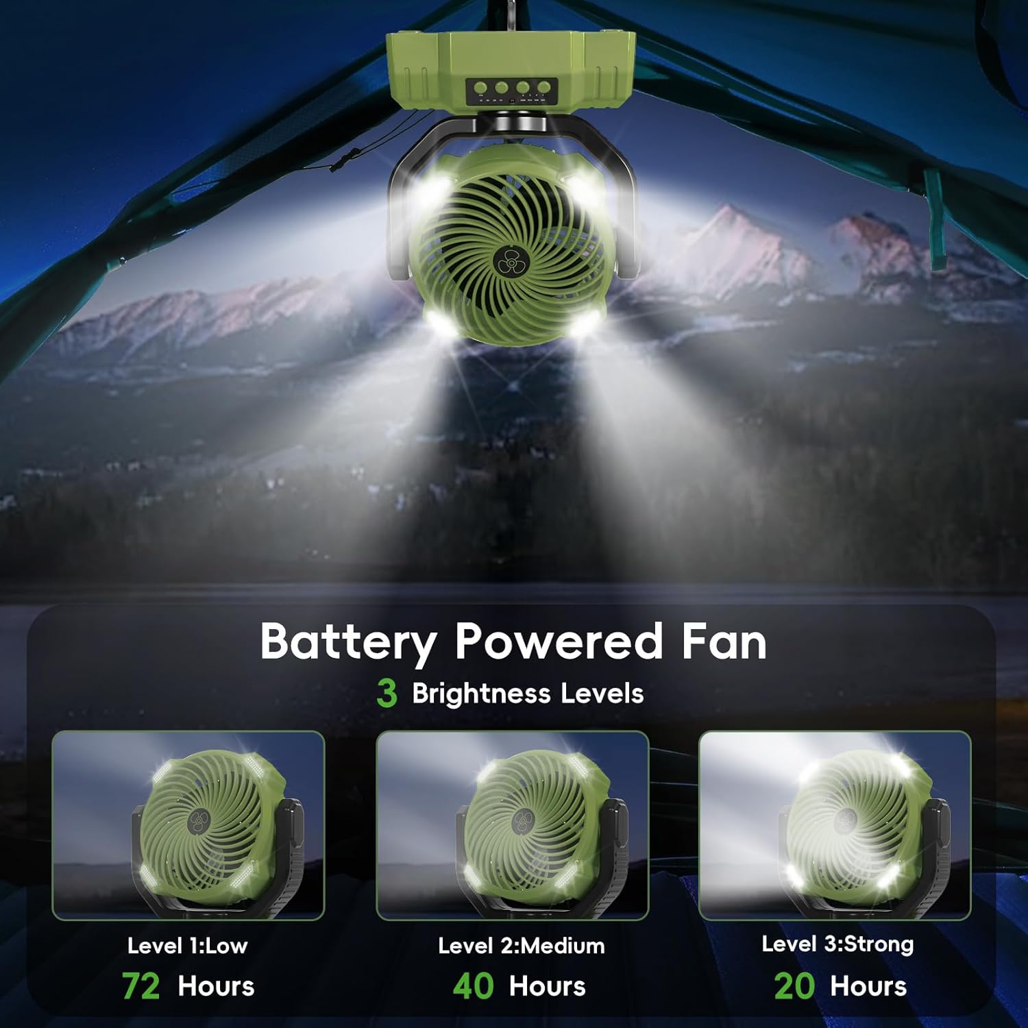 Adjustable Wind & Illumination: This battery powered fan combines fan and light in one. Four levels wind meet different temperature needs and three levels lighting meet various scene needs. Whether you are indoor or outdoor, reading or barbecuing, you can have the suitable wind and lighting