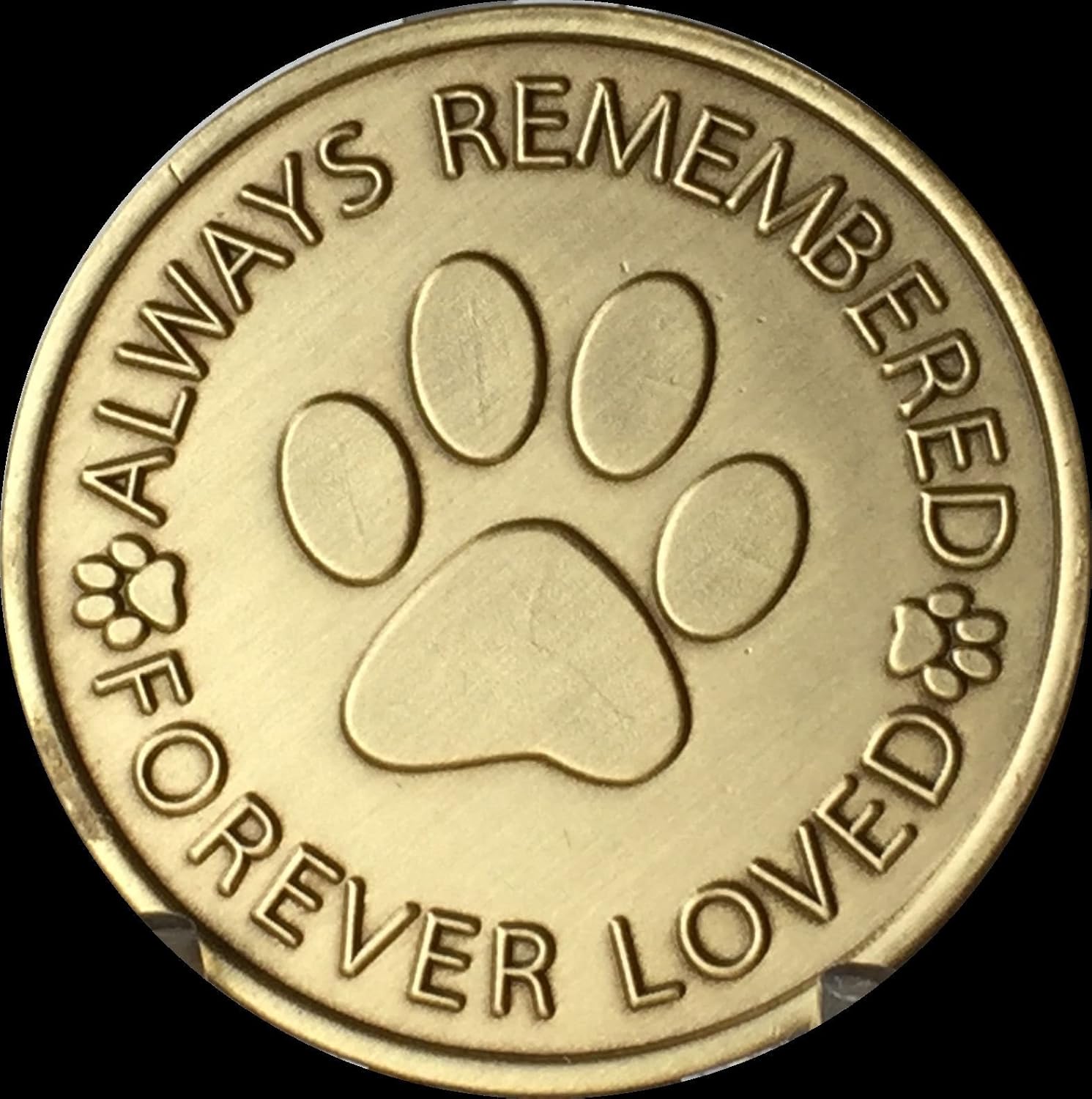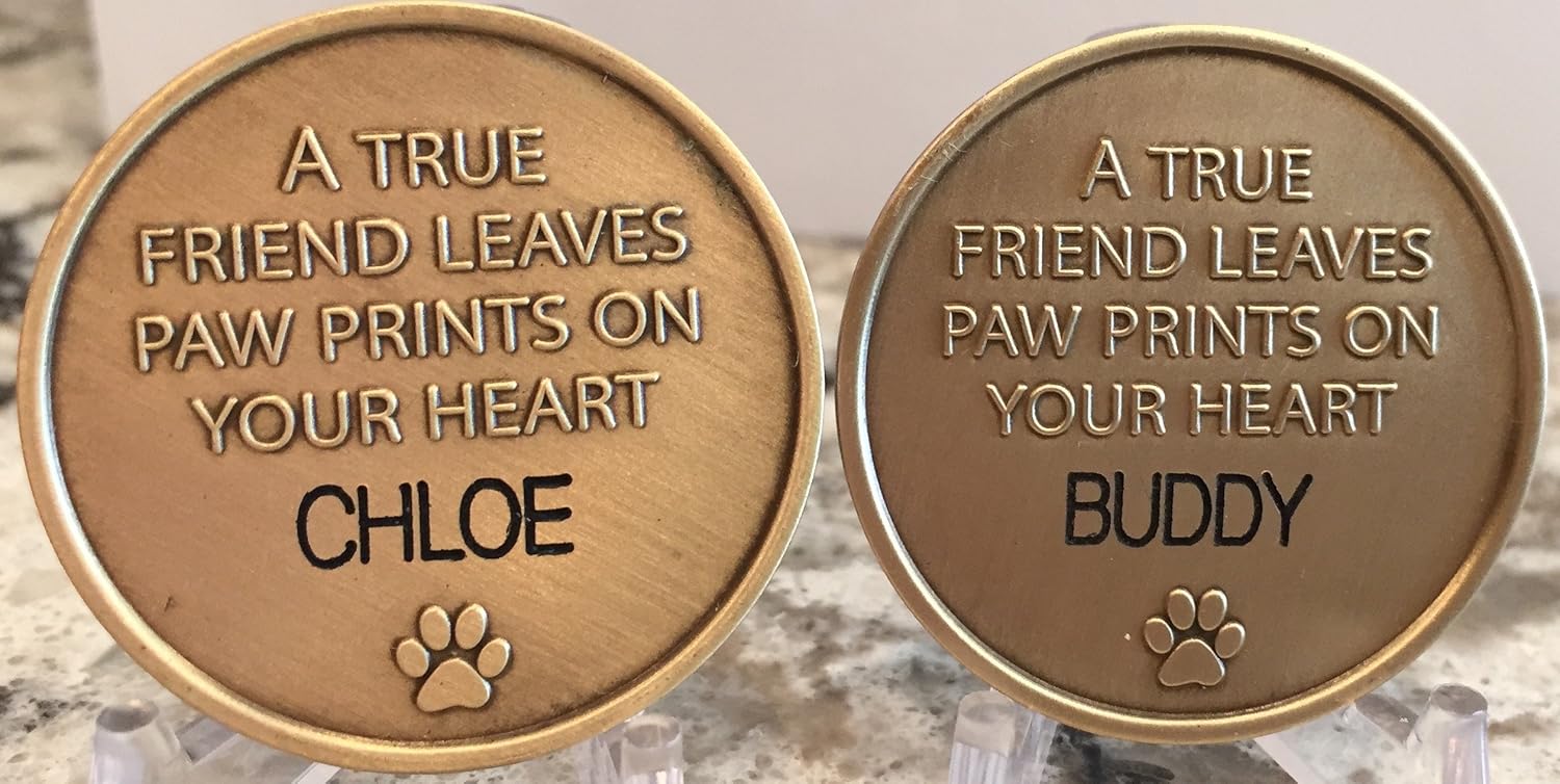 Stunning personalized engraved pet memorial coin. Says Always Remembered Forever Loved on the front and has a raised 3D paw print and text. Back says A True Friend Leaves Paw Prints On Your Heart and has your pets name engraved. The engraving is included Coin is Bronze and 1 5/16″ or 34mm in diameter. About half dollar size. Made in the USA.