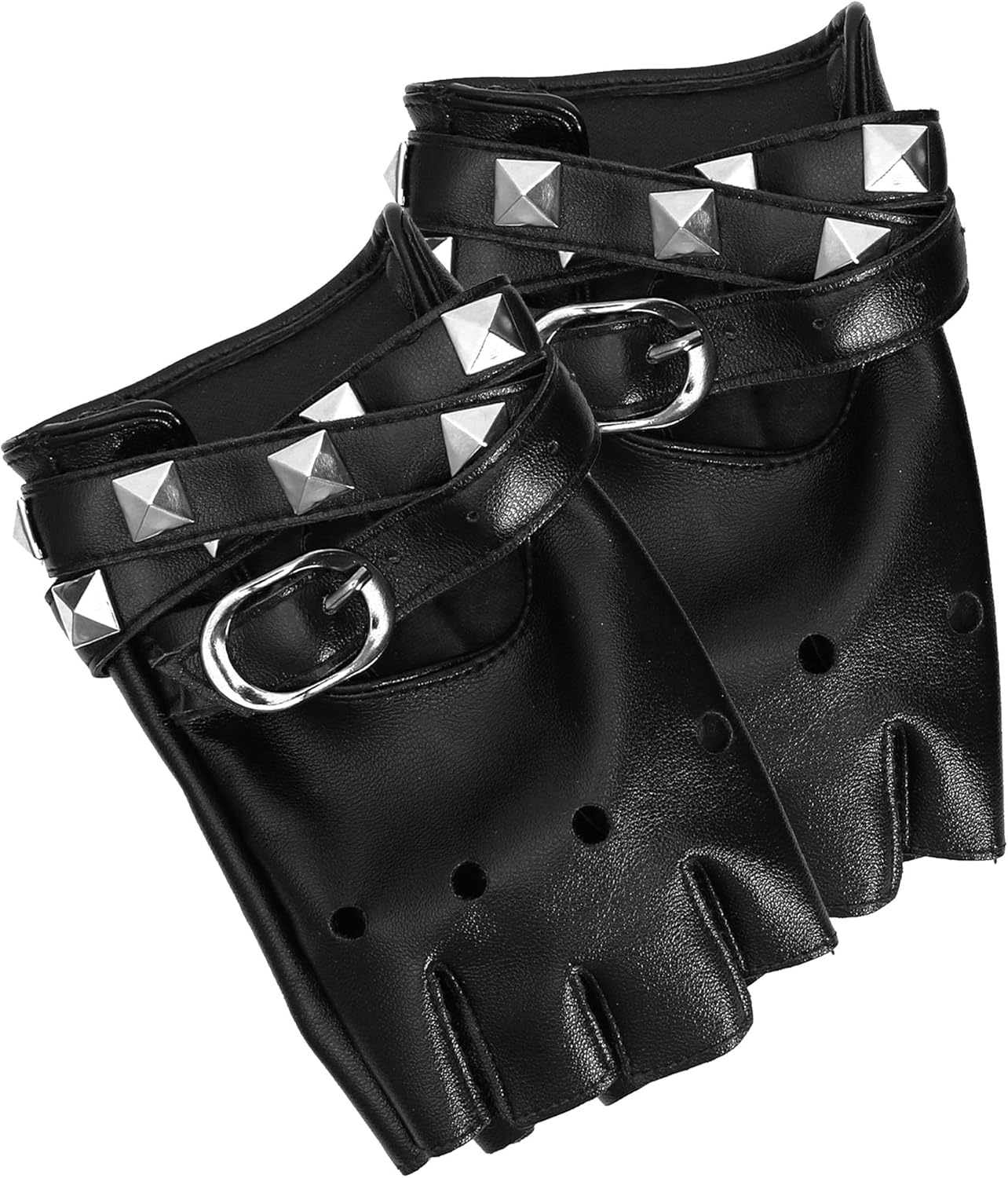 Skeleteen Fingerless Faux Leather Gloves – Black Biker Punk Gloves with Belt Up Closure and Rivet Design for Women and Kids