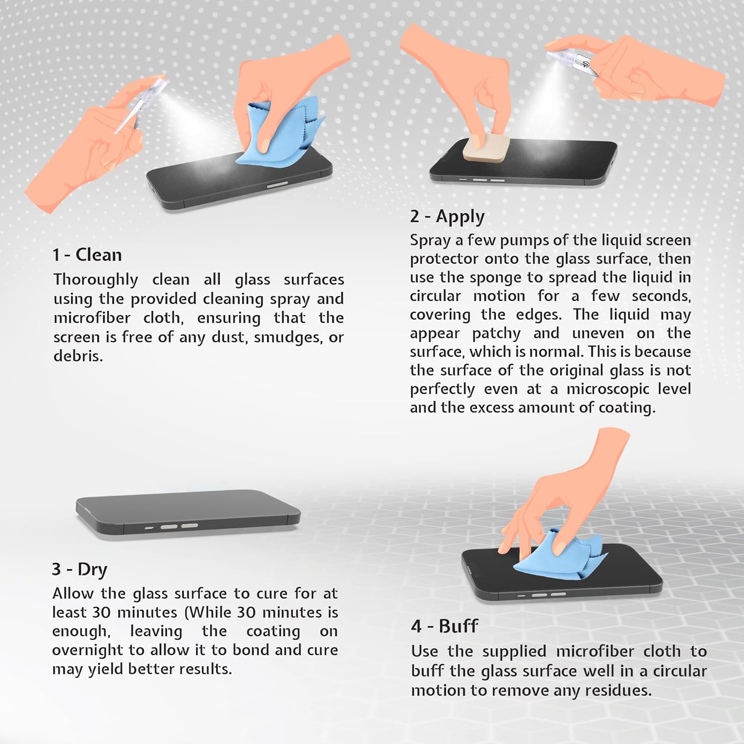Think of the SPRAY-ON Liquid Screen Protector as a friendly helper. Using advanced SiO2 technology combined with a unique proprietary element, it fills in those tiny valleys and strengthens the peaks on your screen. This isn’t just surface-level protection – it’s enhancement.