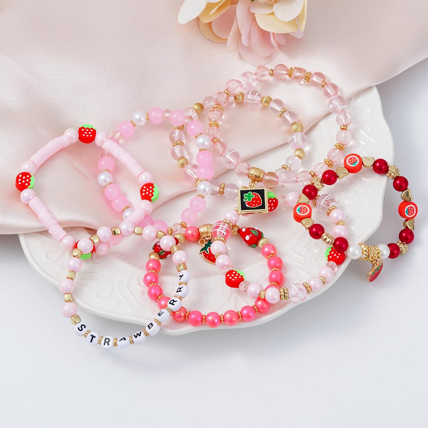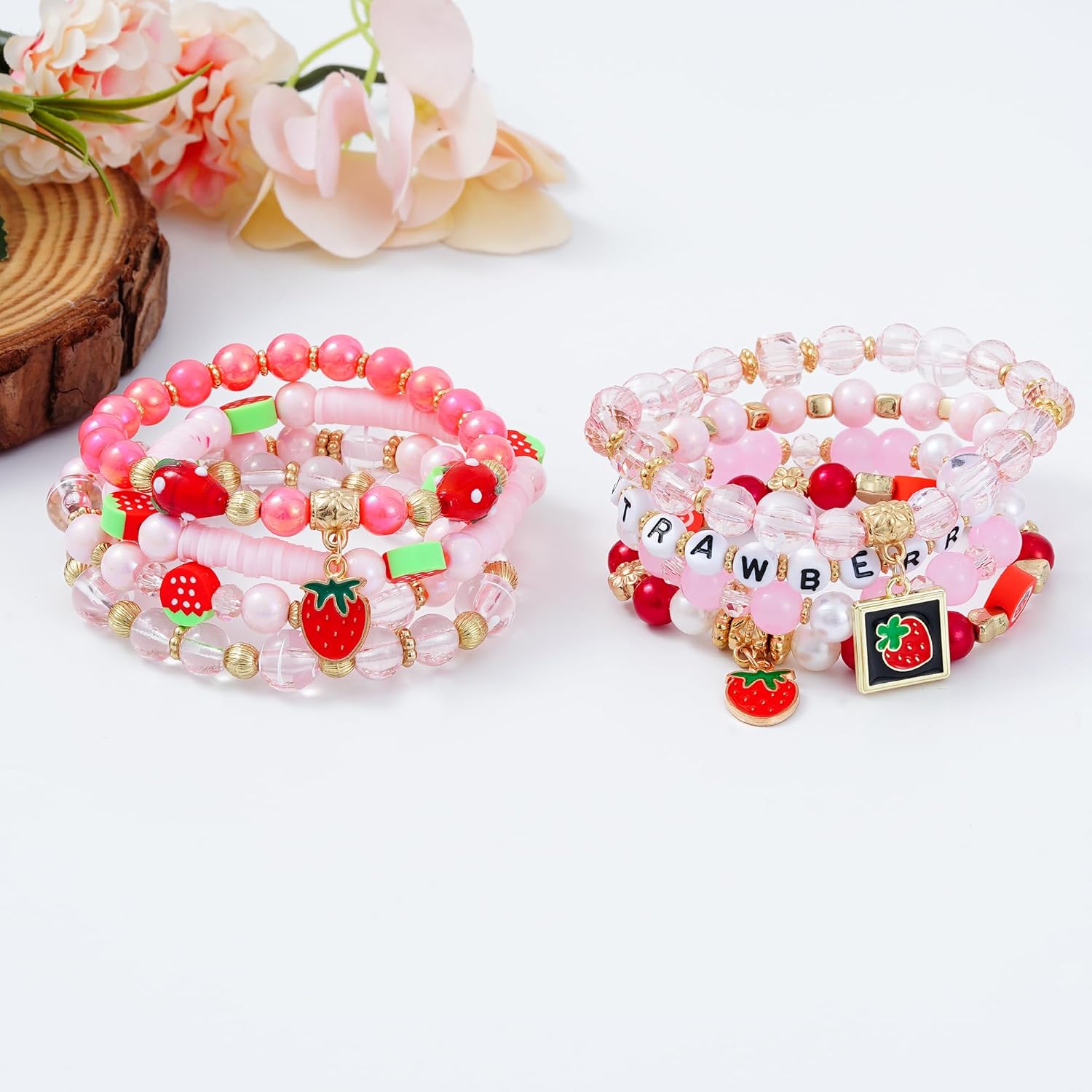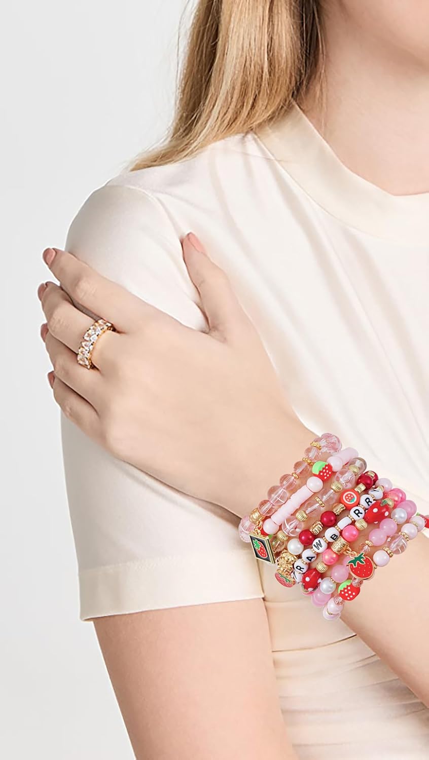 Summer Surfer Heishi Bracelet Set for Women Stackable Gold Clay Ploymer Bead Stretch Pink Beach Layering Bracelets Jewelry