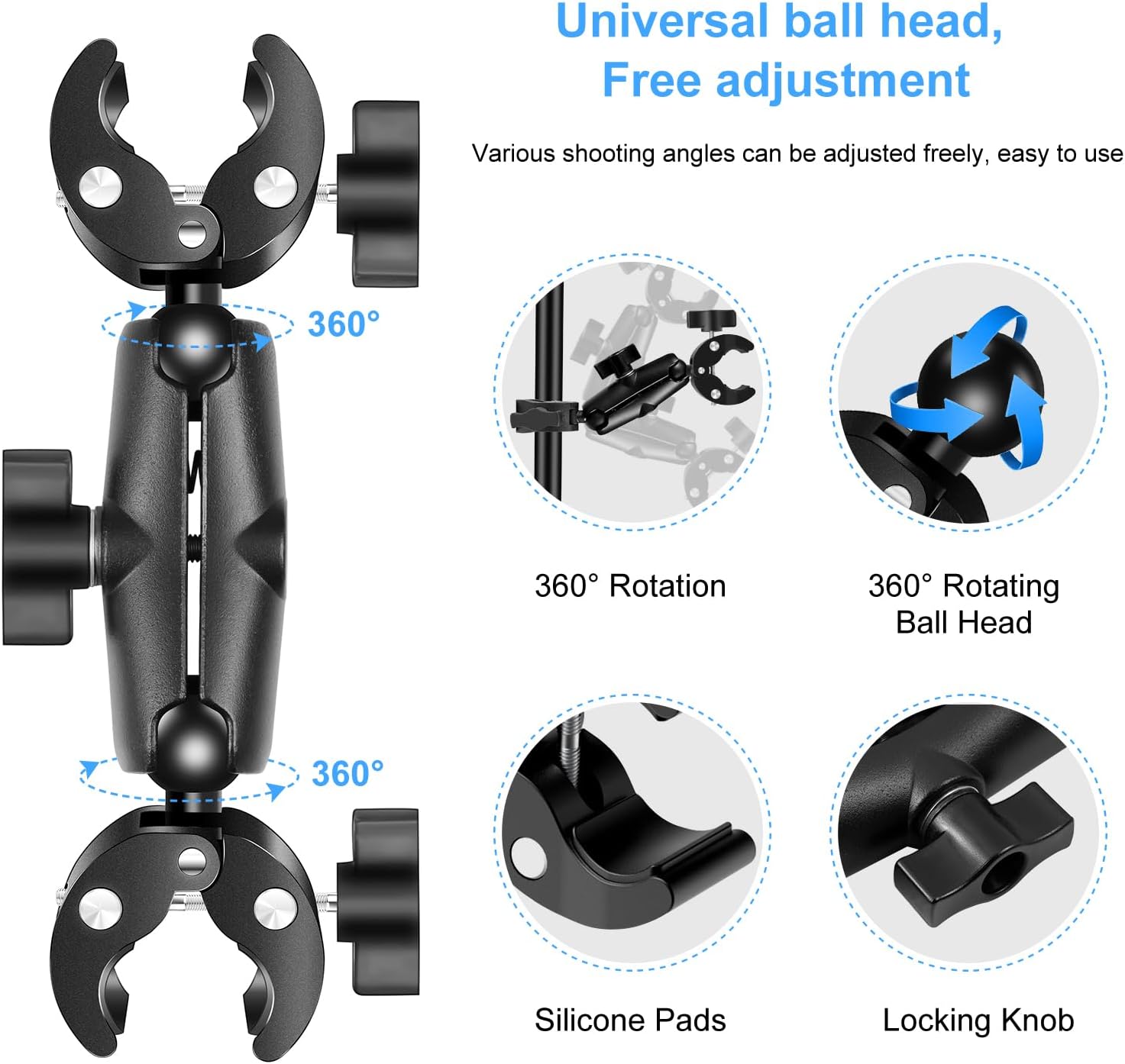 Wide Adaptability: Double super clamps support 1.5-4 cm range caliber handlebars, crossbars, selfie sticks, etc.; Mainly used for cycling to reinforce the selfie stick, so that the selfie stick is doubly fixed; Can be widely used in sports camera bracket, cell phone bracket, lamp light holder, umbrella apparatus fixed bracket, selfie stick bracket, photographic reflective plate fixed clamps and other scenarios. Ensure that the equipment is stable and immobile at various angles, ideal for sports cameras, cell phones, light stands, etc.