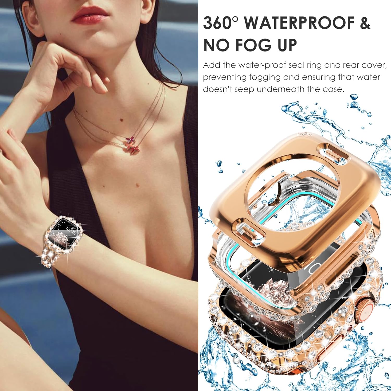 What you get:1x Apple watch band + 1 x Waterproof bling apple watch case.Compatible with Apple Watch Series 9 41mm/45mmCompatible with Apple Watch Series 8 41mm/45mmCompatible with Apple Watch Series 7 41mm/45mmCompatible with Apple Watch Series 6 5 4 40mm/44mmCompatible with Apple Watch SE 40mm/44mmCompatible with Apple Watch SE2 40mm/44mm