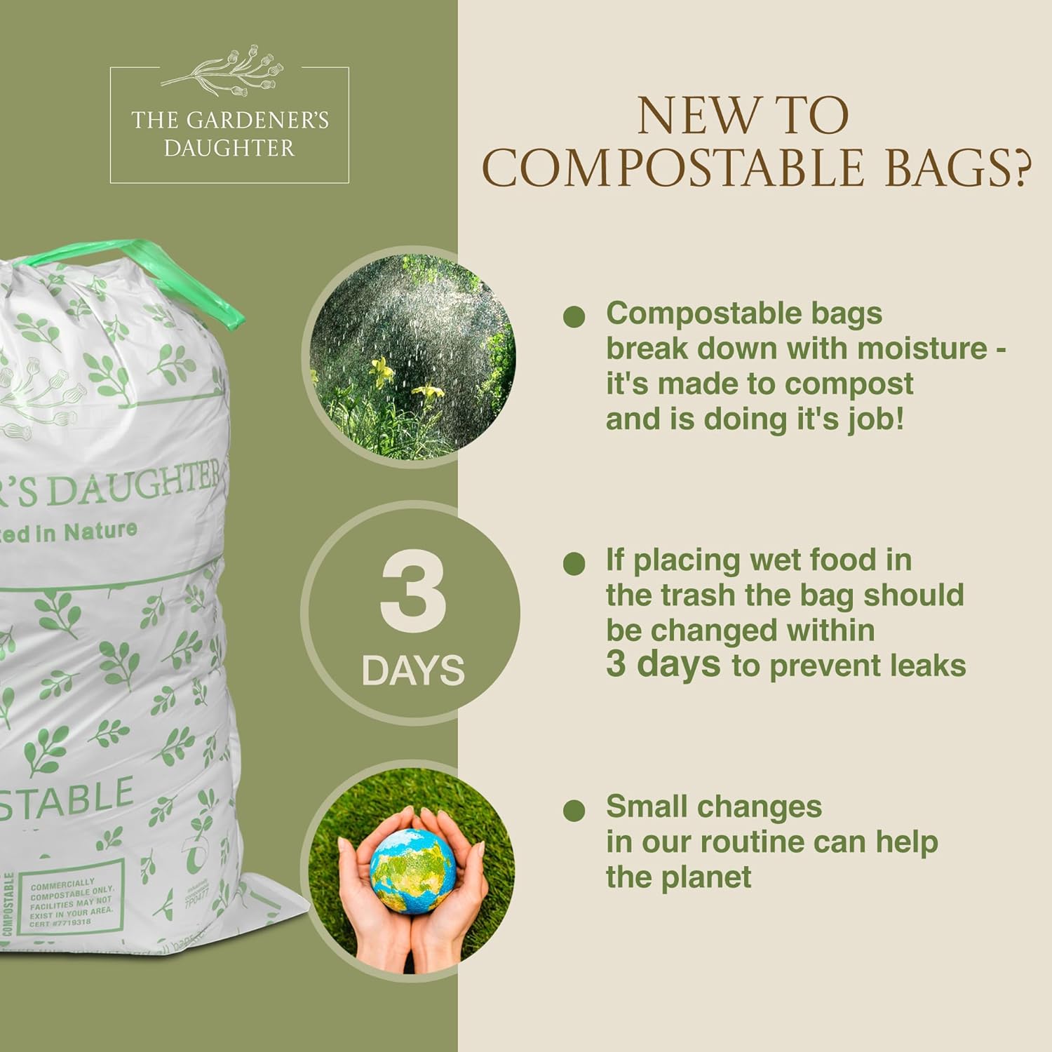 The Gardener’s Daughter Compostable Trash Bags – 13 Gallon, 30 Count, Extra Strength, White, Drawstring Kitchen Waste Bag, BPI and TUV Certified, OK Home Compostable – (Evergreen)