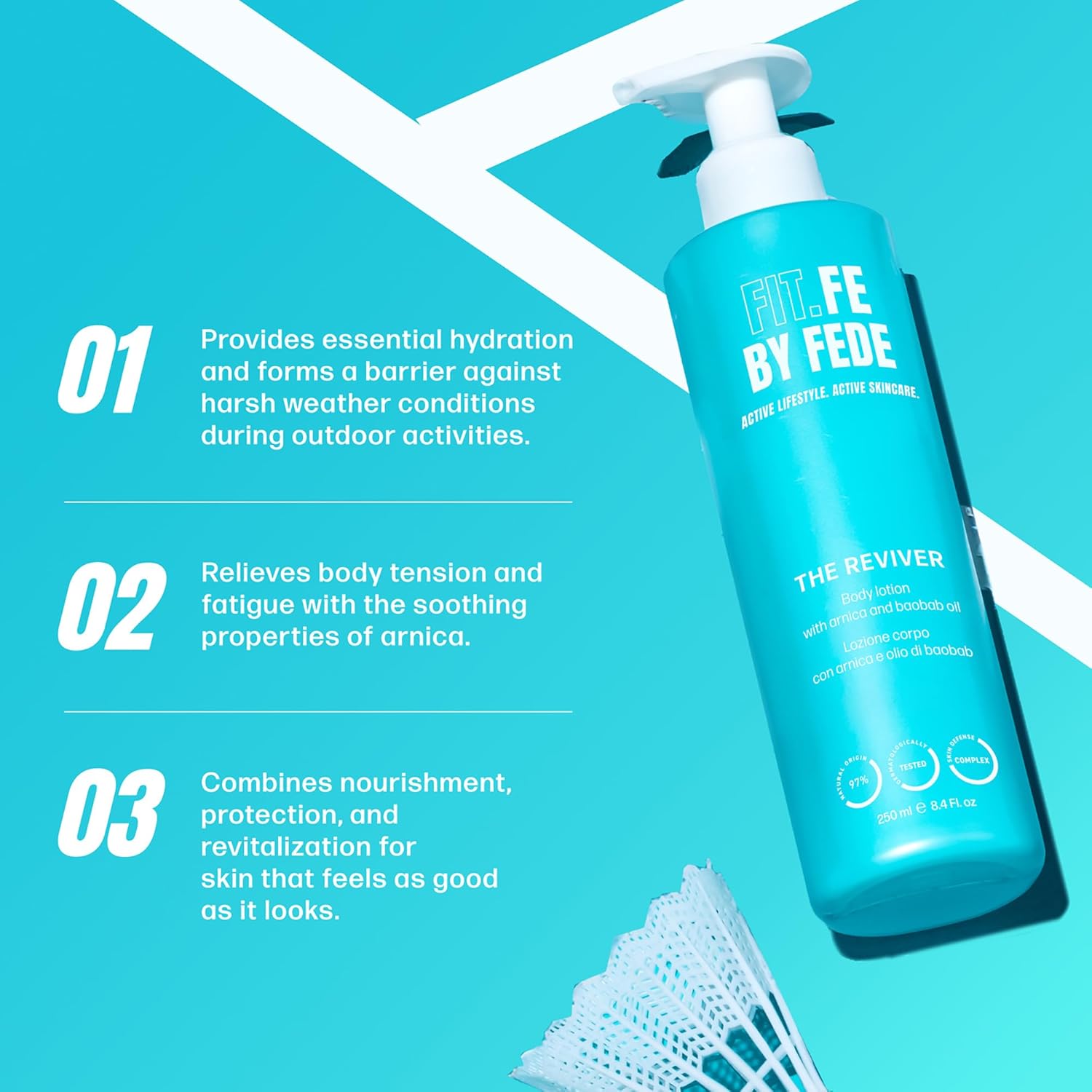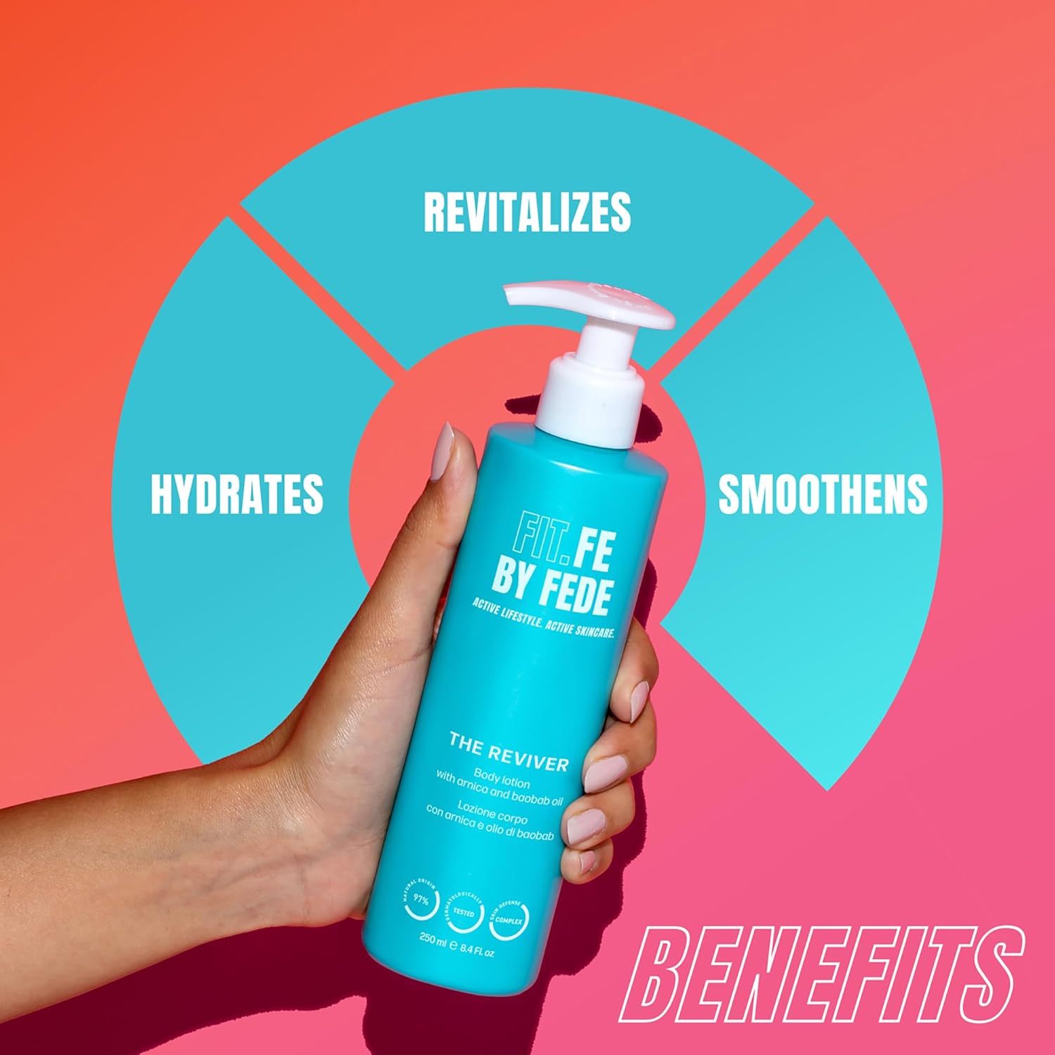 After a busy day of work and exercise, your skin deserves dedicated care that replenishes and restores. FIT.FE BY FEDE The Reviver Body Lotion is formulated as a fast-absorbing lotion to revitalize and deeply moisturize tired skin. This body lotion is enriched with arnica and baobab oil, which work together to soothe skin while delivering intense hydration. This body moisturizer is an exquisite blend of natural ingredients, with over 95 percent of its components derived from nature. The Arnica and Baobab Oil enriches the formula with deep moisturizing capabilities, making it an ideal body lotion for dry skin. Lightweight and non-greasy, it absorbs quickly, allowing you to indulge in the luxury of smooth, silky skin without any residue. This moisturizing body lotion leaves your skin feeling soft, nourished, and revitalized. Vegan and cruelty-free, this hydrating lotion ensures that you can care for your skin with a clear conscience. Enhance your skin care routine today with The Reviver Body Lotion by FIT.FE BY FEDE, where every application is a step towards complete wellness. Elevate your personal care products with this moisturizing cream, and discover the transformative power of a truly moisturizing lotion.