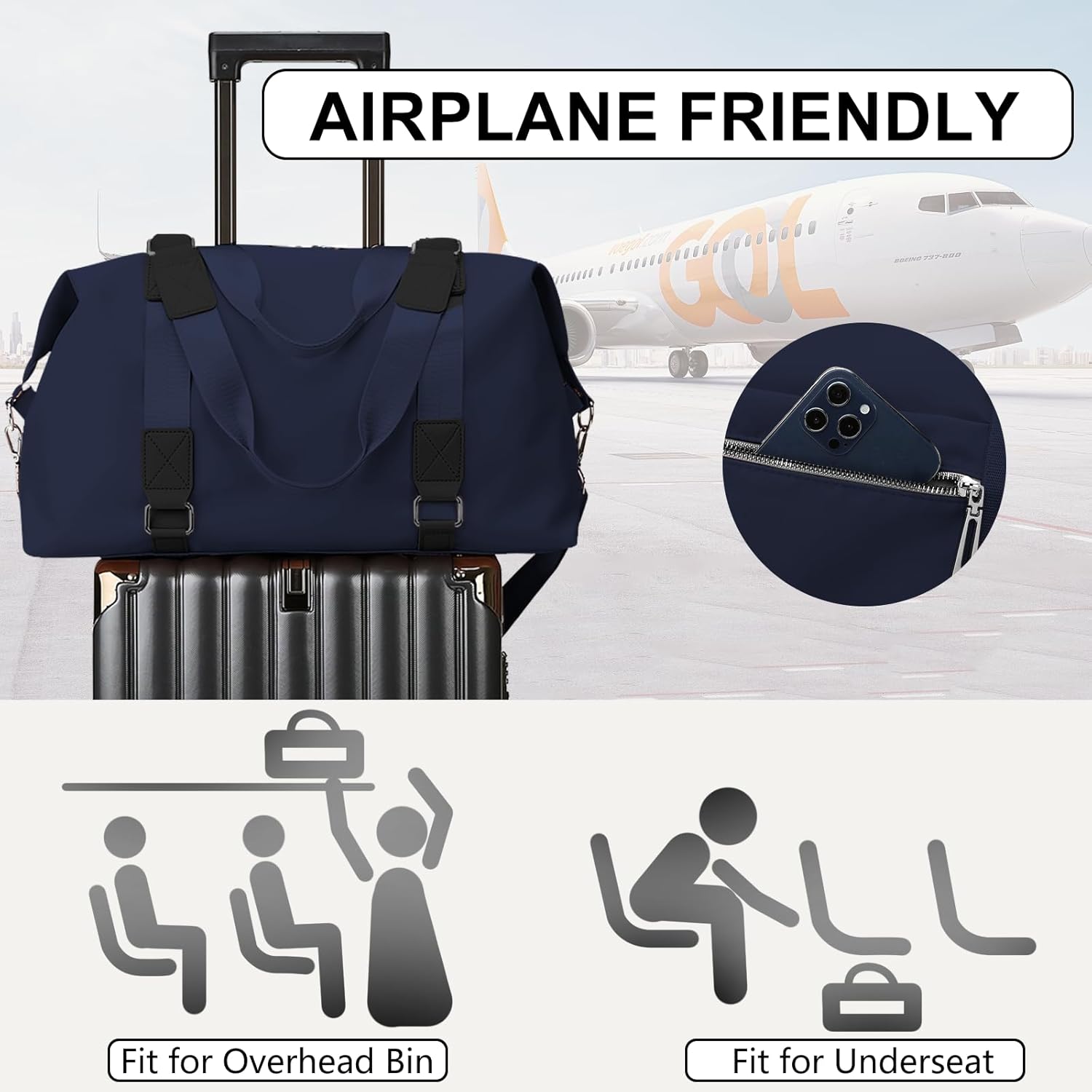 【Airplane Friendly Carry-on Bag】: This duffle bag for travel is designed to be carried easily, making it an ideal companion for your journeys. This bag measures 49*30*20CM/19.3*11.8*7.9 inches, which meets the requirements of most airlines and can be carried on board as a personal item. It is easy to store in the overhead luggage compartment or under the seat.
