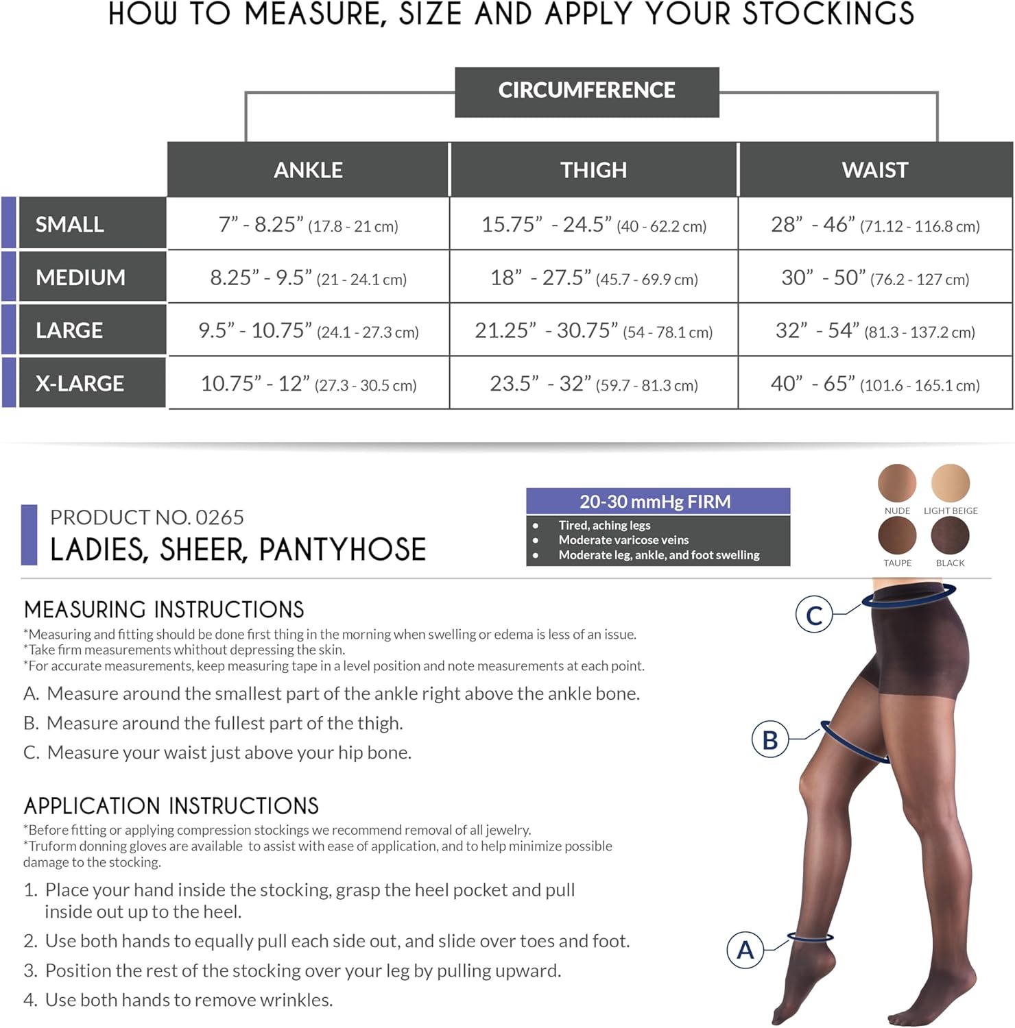 Truform 0265 from the TruSheer line is designed to help restore leg health and reduce discomfort. They provide long-lasting medical-grade support, yet have a sheer look and feel that appeals to today’s active, fashion conscious woman and are excellent for both business and casual wear. The 20-30 mmHg firm compression level is great for tired, aching legs and moderate varicosities, varicose veins, spider veins, moderate edema, post surgery and post sclerotherapy, help to prevent venous ulcerations and thrombophlebitis, and more. Truform stockings, socks and pantyhose feature Graduated Compression Technology, which delivers a compressive action to the leg that is greatest at the ankle, then gradually decreases toward the heart. This graduated compression provides two primary benefits to the legs: increased pressure on tissues beneath the skin helps reduce and prevent swelling for the wearer, and the compression action helps control the size of the superficial veins that lie just beneath the skin; preventing the slowing of blood flow so it can flow more quickly up the leg and back toward the heart. Truform graduated compression support hosiery helps maintain positive circulation and leg health. We combine the best materials, the latest methods of semi-automated manufacturing, and hand craftsmanship to produce a high-quality product at affordable prices. We take the extra time and effort necessary to insure a therapeutically effective, comfortable fit. The combination of state-of-the-art materials and equipment, plus knitting know-how sets us apart from the crowd to make your legs look and feel great.