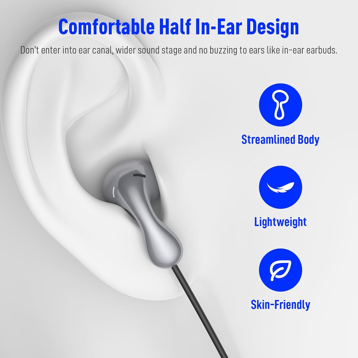 — 45° Half In-Ear Design – Broader sound stage than in-ear earbuds, no buzzing and poping experience.