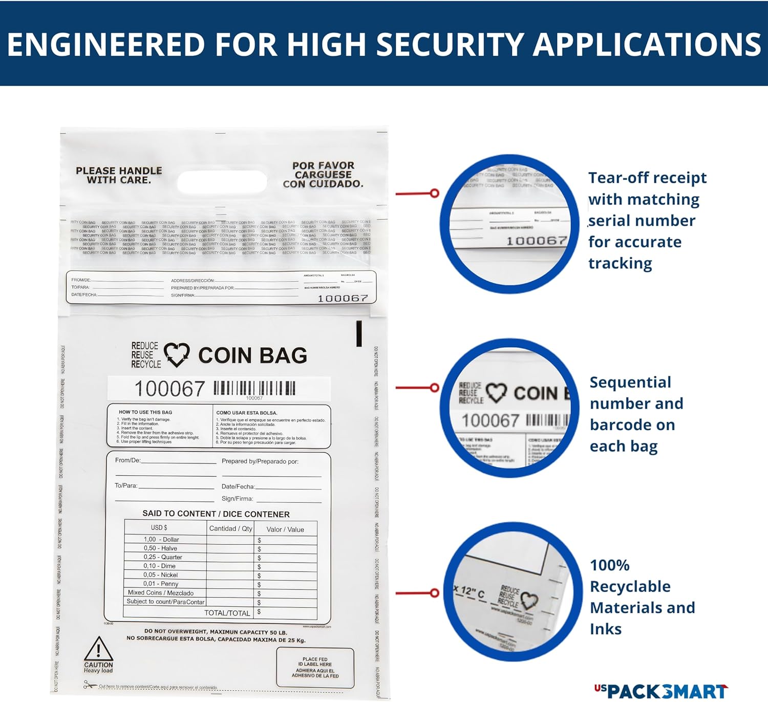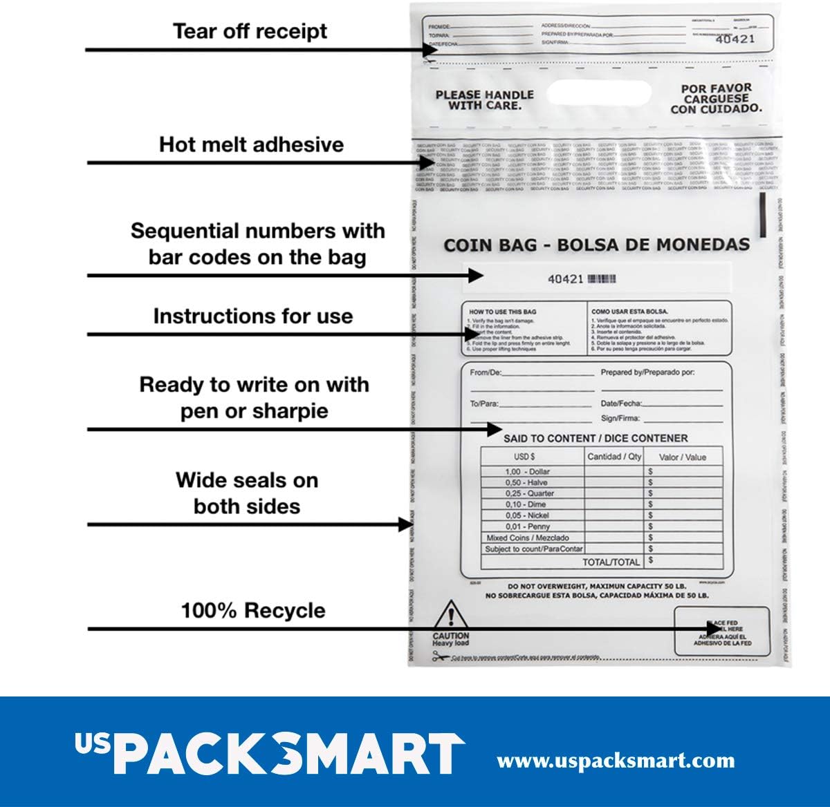 USPACKSMART Clear Plastic Coin Bag 12.5″ x 21.5″ | 50 lb. Capacity | Sequential Barcode Number, Self-Sealing, Permanent Adhesive | Ideal for Handling and Transport of Coins and Casino Chips | 50-Pack