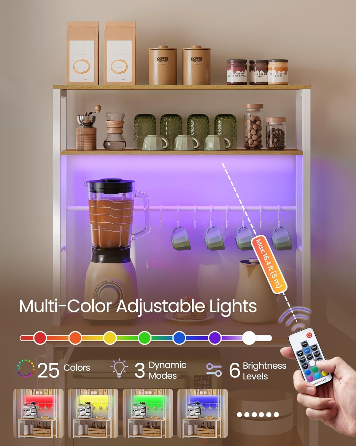 【AMBIENT LED LIGHTING】The built-in light strip of this coffee bar offers 25 colors and 3 dynamic modes. You can attach it under the top shelf or worktop, creating a lively party atmosphere or a cozy corner in your home