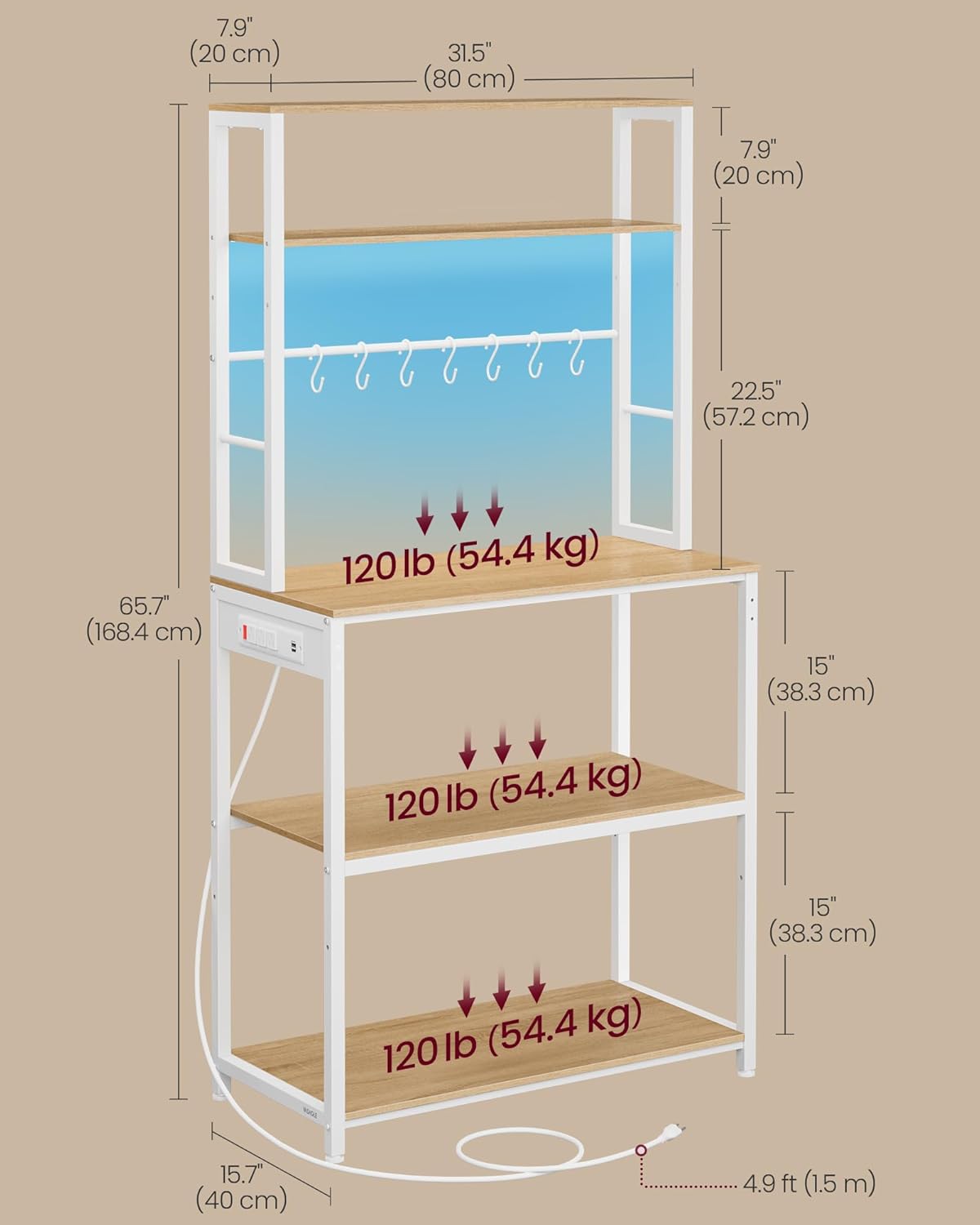 Be the first to review “VASAGLE Coffee Bar with LED Lights, Kitchen Bakers Rack with Power Outlet, Microwave Stand with Adjustable Shelves, 8 Hooks, 15.7 x 31.5 x 65.7 Inches, Golden Oak and Matte White UKKS050Y01”