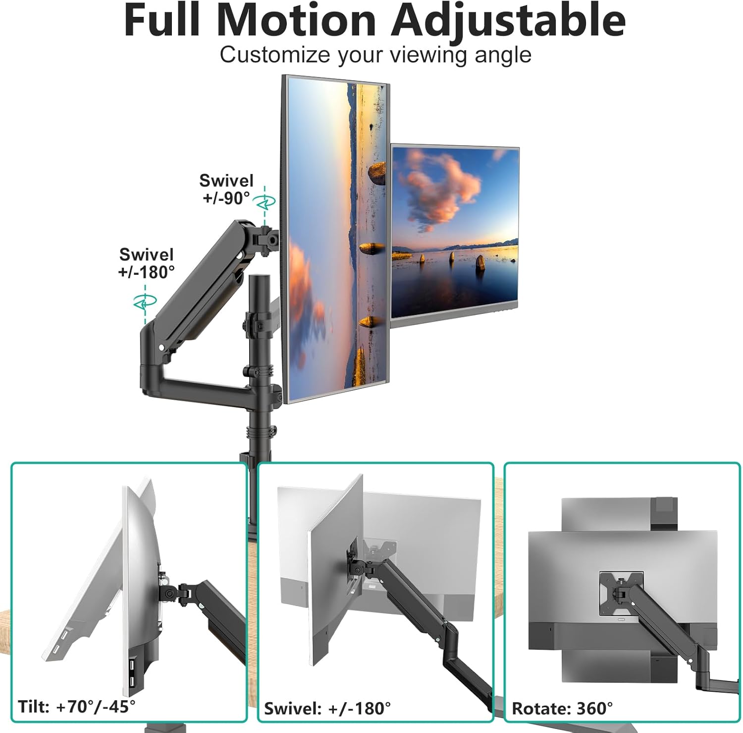 Adjustable Monitor Stand: The gas spring stand can tilt +70°/-45°°, swivel +/-180°, and rotate 360°, Max height is up to 26.6″, and max extension is up to 20.3″. Easily configure ergonomic perspectives to maximize comfort and productivity.