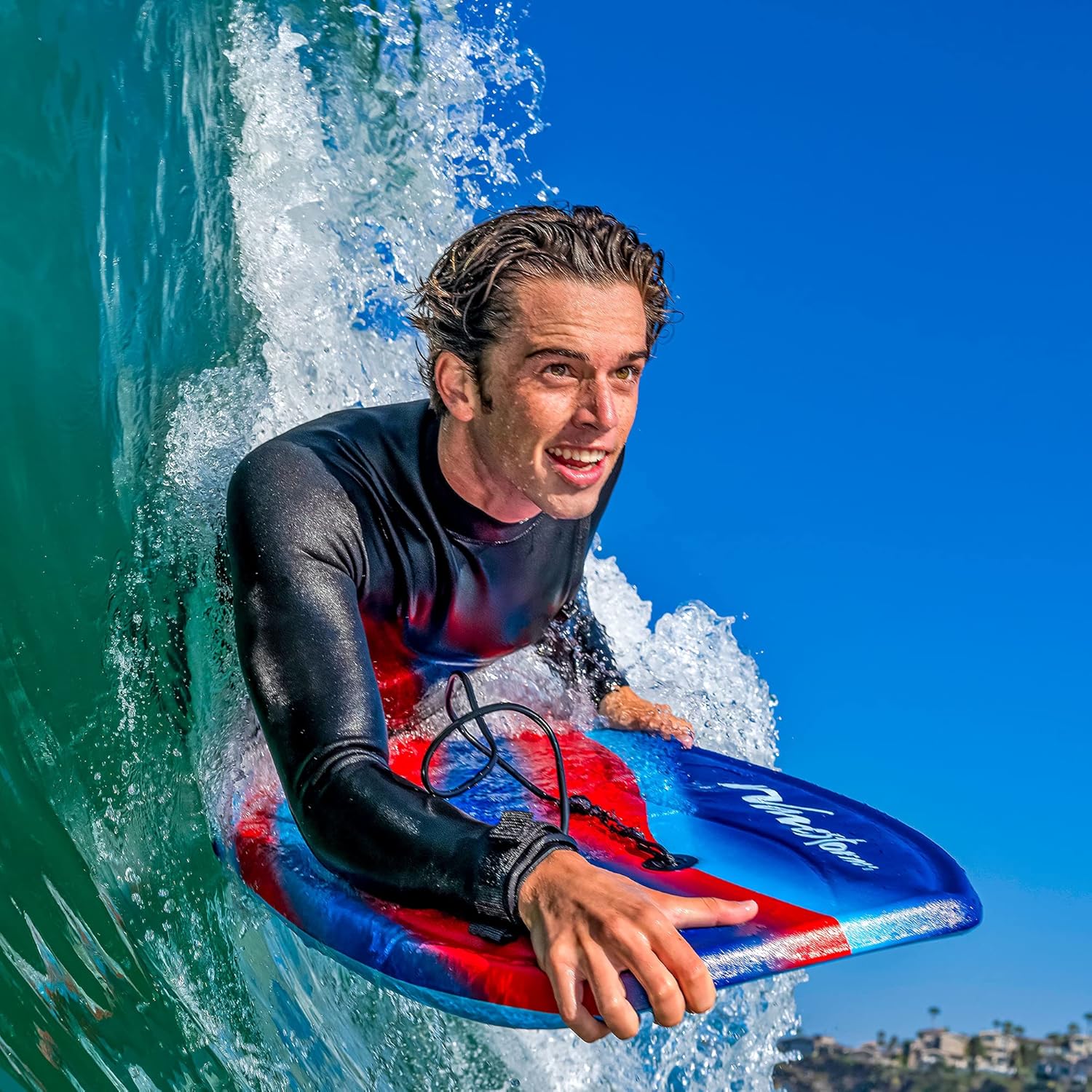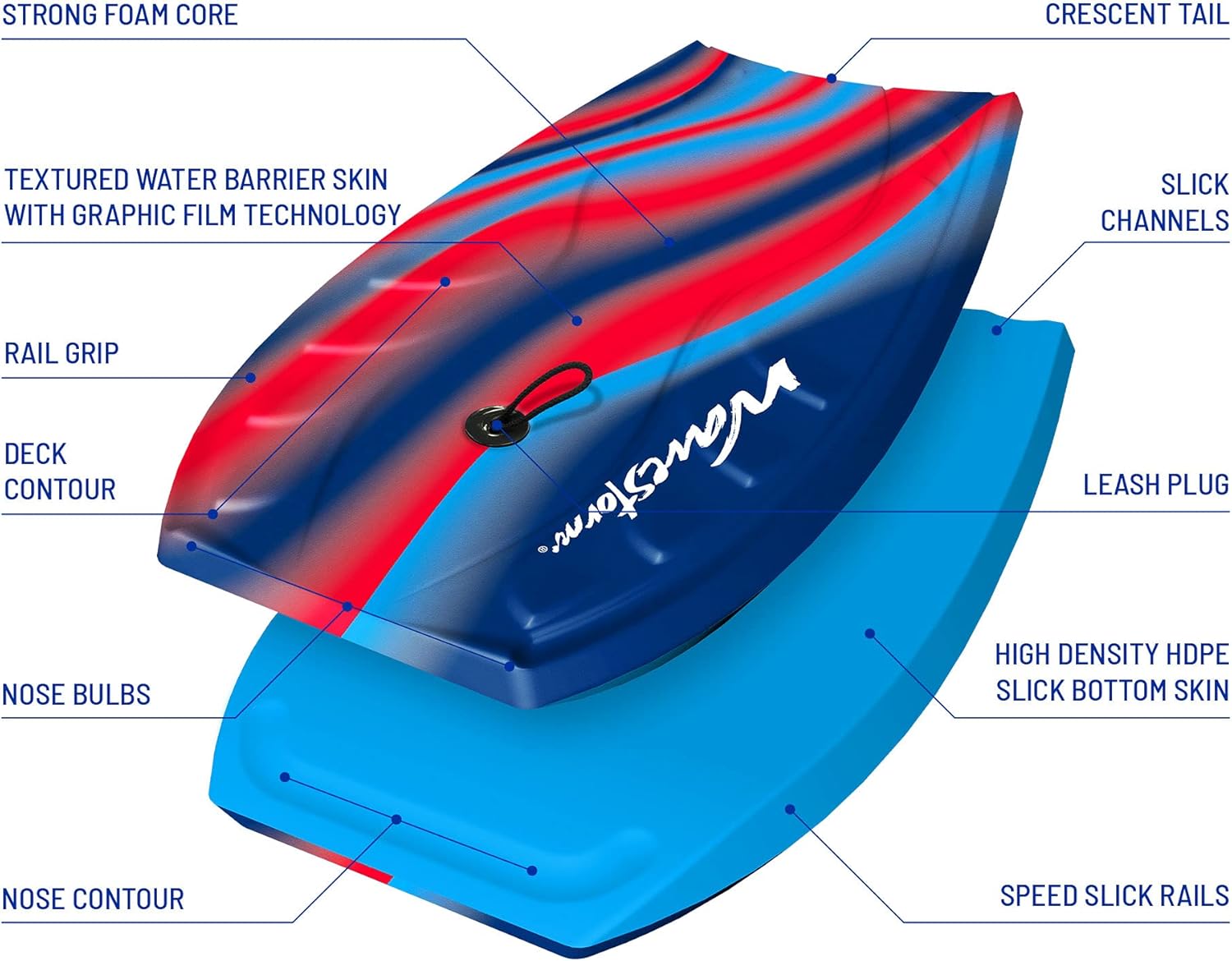 The Wavestorm Body Board is 40 inches in length; excellent for recreational fun at the ocean, lake, or pool; large enough size for youths or adults; and constructed with quality patented materials and craftsmanship. Each foam bodyboard is lightweight and strong. Featuring a superior expanded foam core and smooth HDPE (High Density Polyethylene) slick bottom for extra rigidity, speed, and recoil. Each board is meticulously crafted for attention to detail with a UV inhibiting patented color deck skin over a molded contoured deck for improved grip in critical areas while riding. Wavestorm surfing body boards all feature hot air lamination with no use of harmful glues or epoxies during construction. Each body board includes a basic wrist leash to help secure riders to the board. Each board is created with the Wavestorm assurance of Quality that any deemed faulty materials are covered under warranty and your satisfaction is of utmost importance. We will respond immediately to any questions or concerns about products Thank you for choosing Wavestorm.