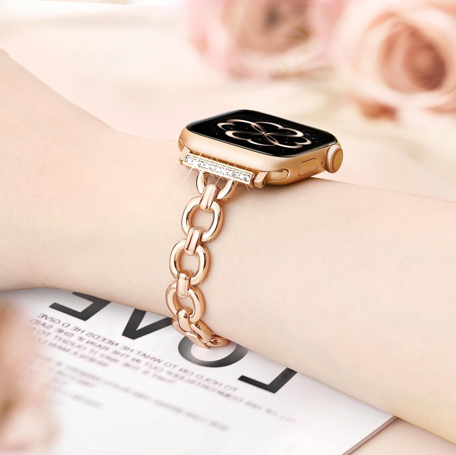 Elegant and slender, this fashion apple watch band is a masterpiece. Each oval link is carefully carved. Its curves flowing gracefully from one link to the next. They create a visually harmonious pattern. Bling diamonds of the slim iWatch bands for women are precisely set into the metal, adding a touch of elegance.