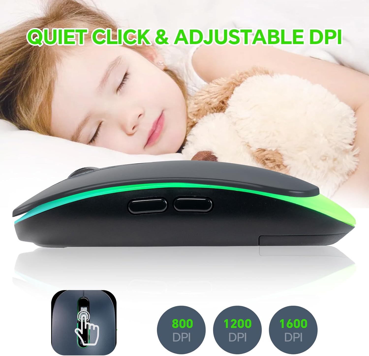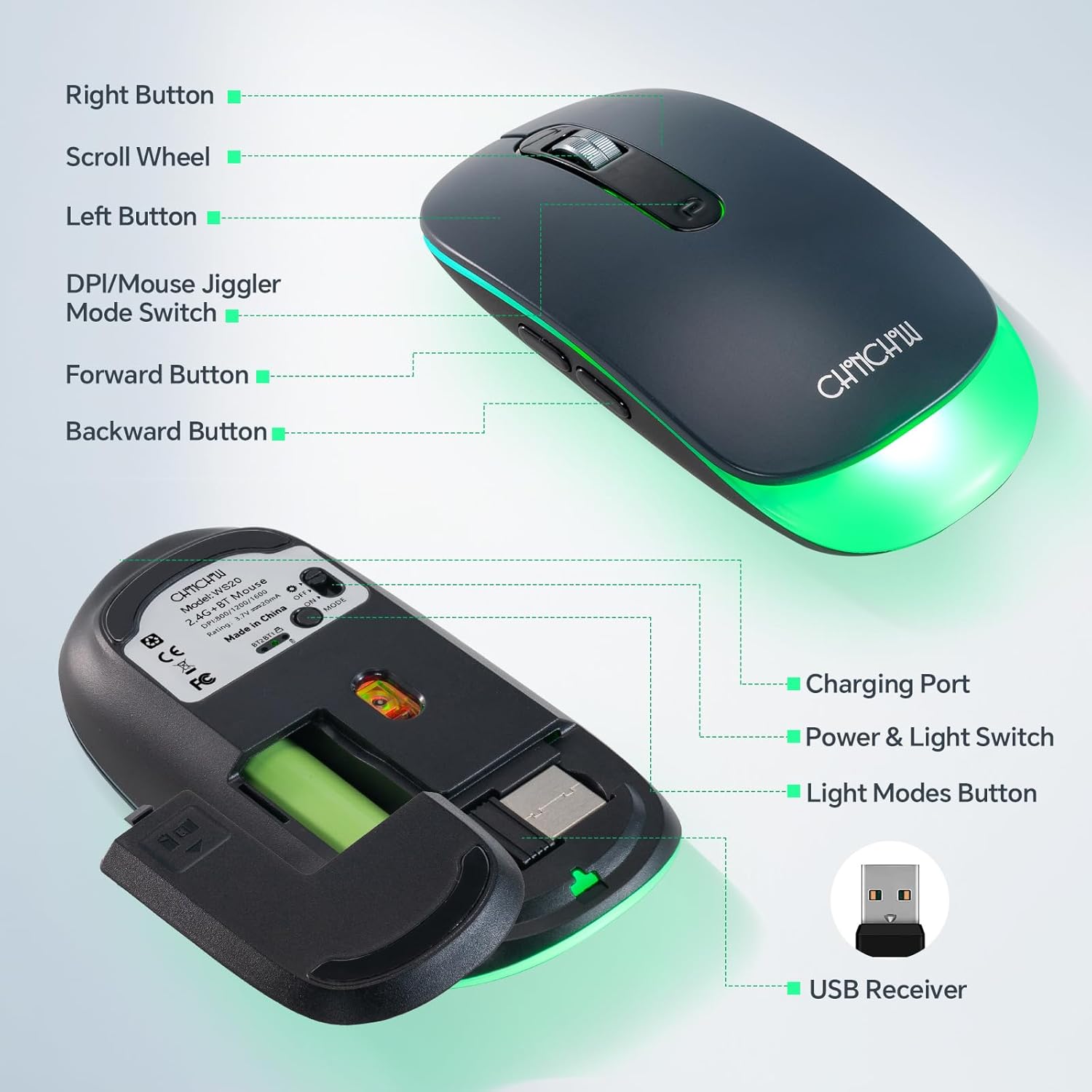 Wireless LED Mouse Rechargeable 2.4GHz/Bluetooth Multi Connect Method Silent Slim with Big Exchangeable Battery 1600DPi USB compatible with Mac Windows for PC laptop office with C-adapter cord manual