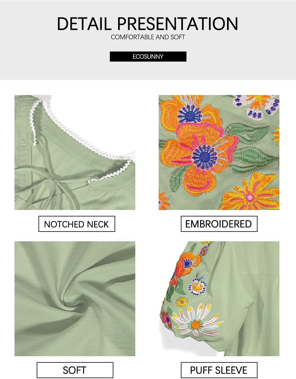 Women’s Casual Floral Embroidered V Neck Boho Puff Short Sleeve Shirts Loose Tunic Summer Blouses Tops Fashion Clothes 2025