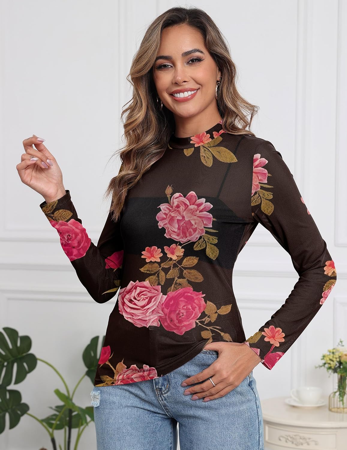 Womens Mesh Floral Long Sleeve Tops Lace Undershirt Mock Neck Going Out Sheer Blouses 2025 Trendy