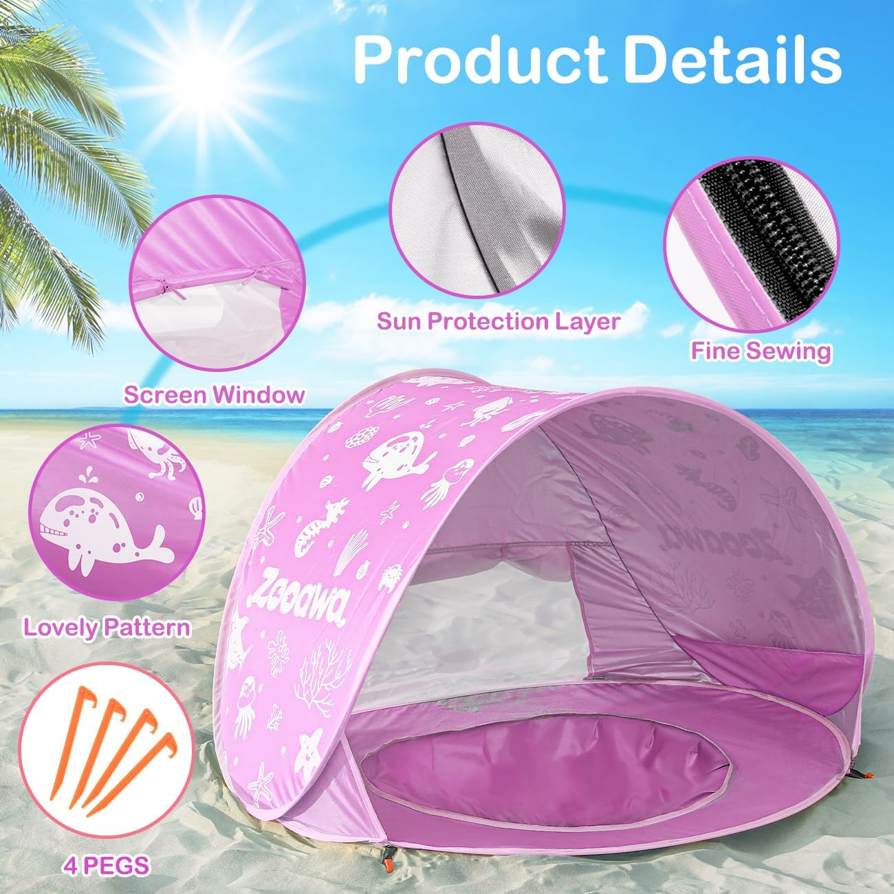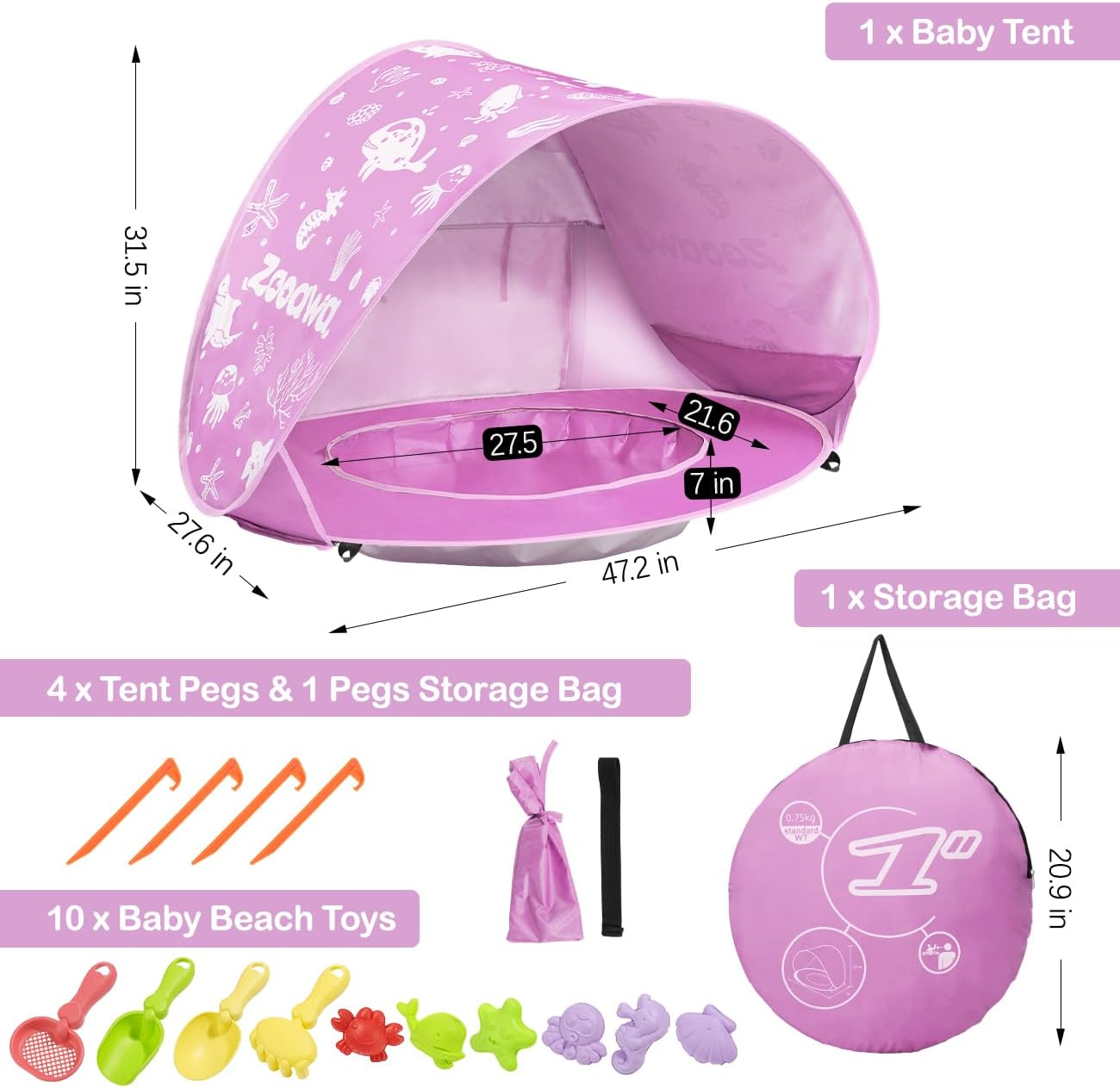 Product Details: Zooawa baby tent with pool measures 47.2 × 31.5 × 27.6 in/120 × 80 × 70 cm when set up. You will get 1 × baby beach tent, 1 × portable carry bag, 4 × tent stakes, 1 × beach toy set (including 4 × sand shovels, 6 × marine animal molds).